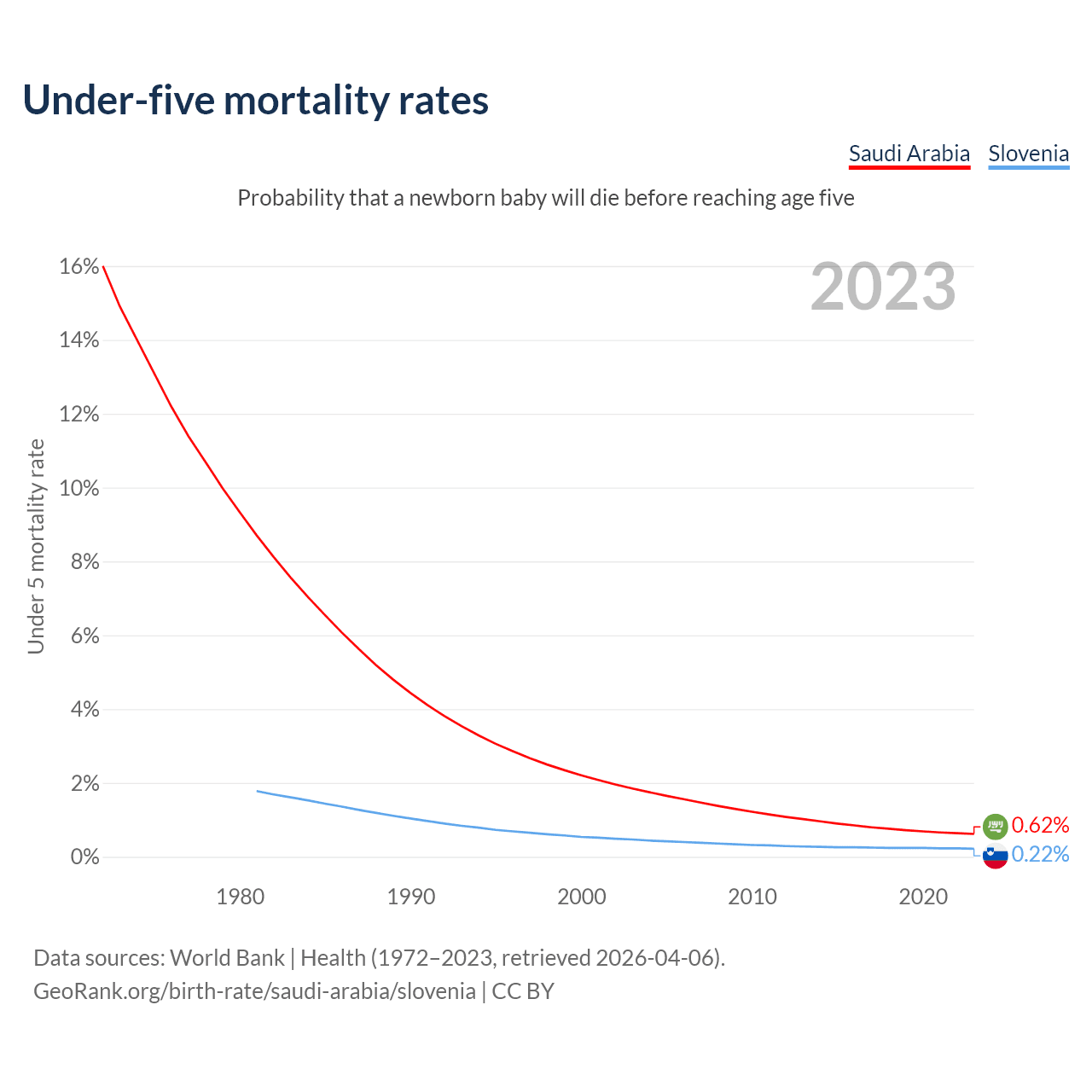 The chance that a newborn baby will die before reaching age five is 0.62% in Saudi Arabia and 0.22% in Slovenia. Above is a chart with historical data on under-five mortality rates.
