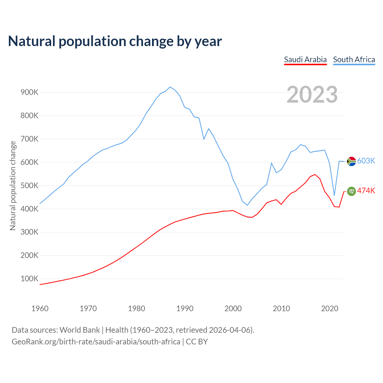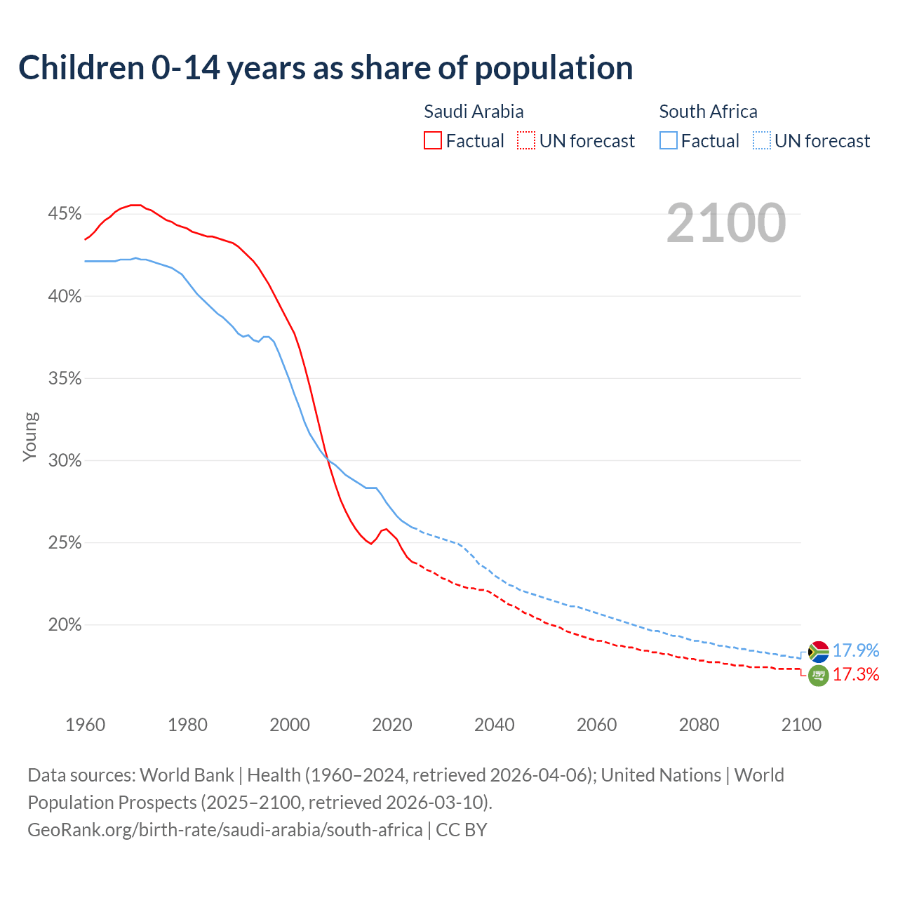 According to the latest available data on birth rates, the fertility rate in Saudi Arabia was 2.28 children per woman in 2023, compared to 2.22 in South Africa in 2023. The replacement level is considered to be 2.1 children per woman.