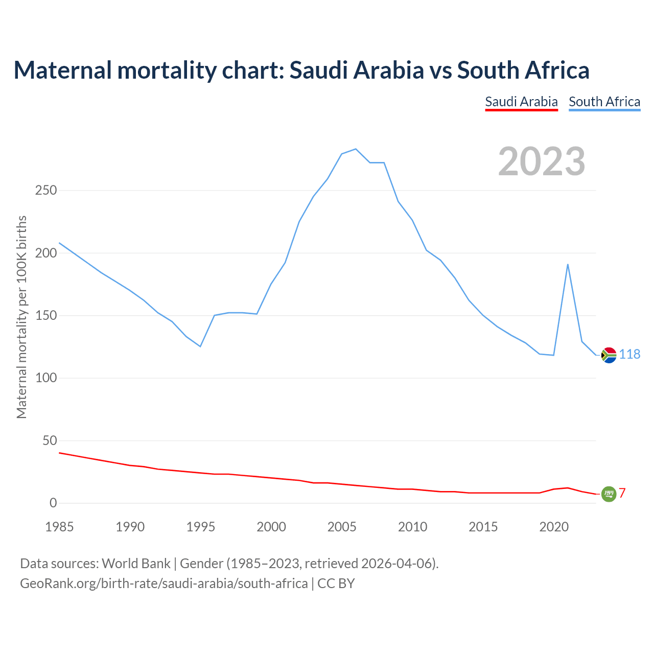 The maternal mortality rate, which is the probability of dying during childbirth or within 42 days of pregnancy termination, is 7 deaths per 100,000 live births in Saudi Arabia, compared to 118 deaths in South Africa.