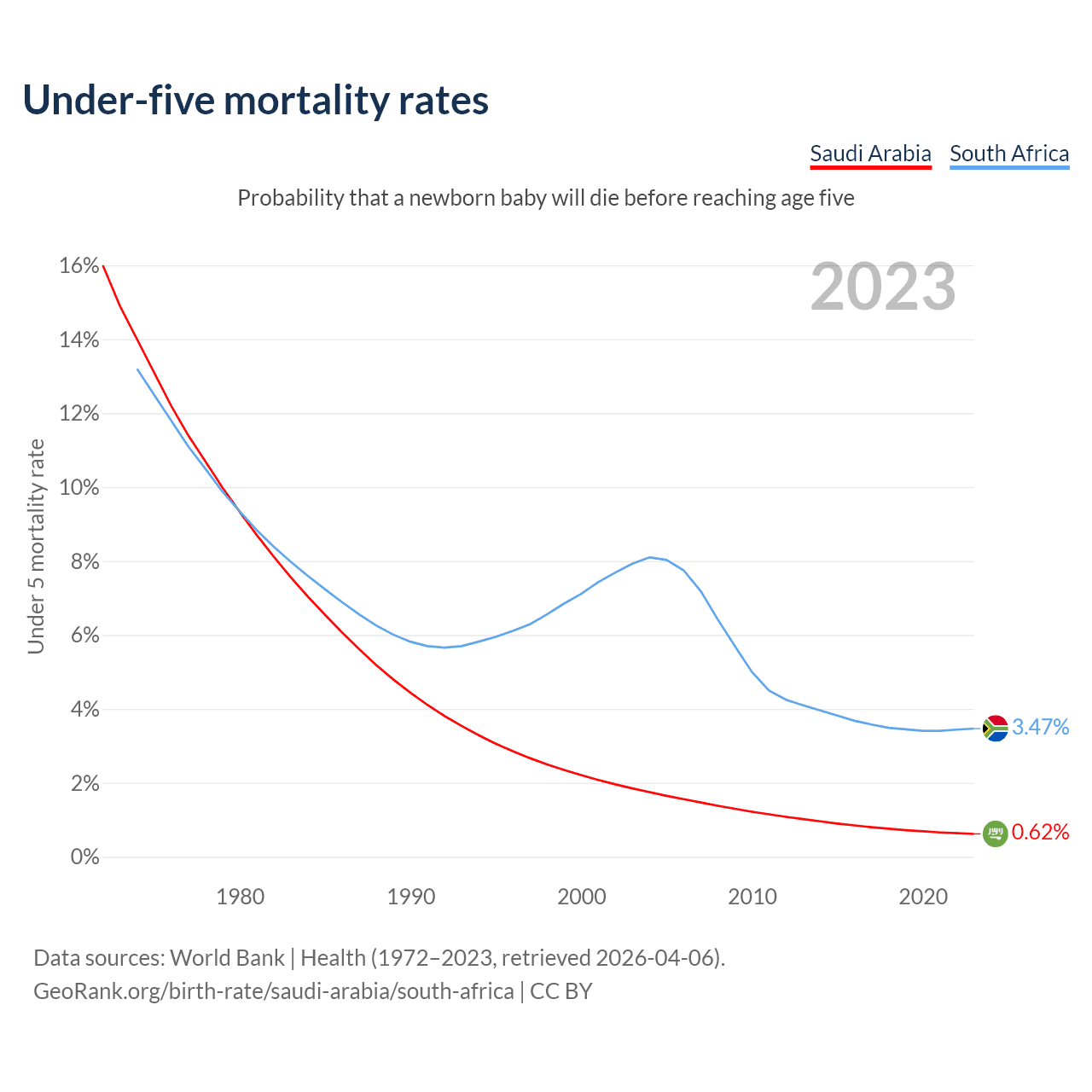 The chance that a newborn baby will die before reaching age five is 0.62% in Saudi Arabia and 3.47% in South Africa. Above is a chart with historical data on under-five mortality rates.