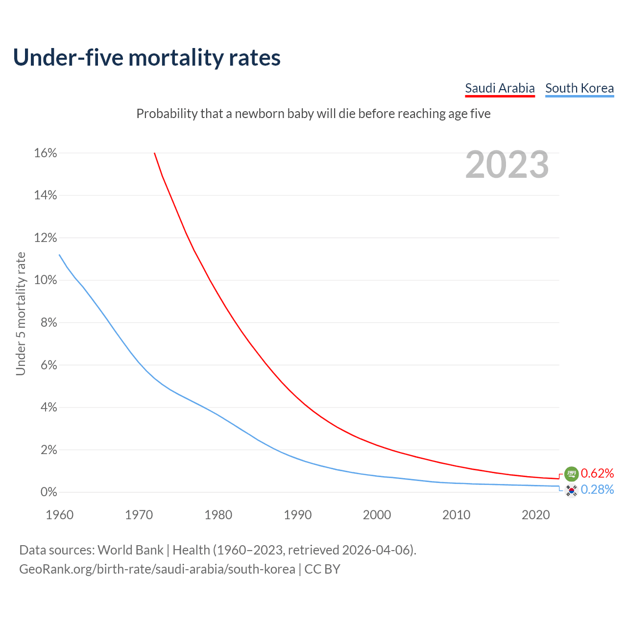 The chance that a newborn baby will die before reaching age five is 0.62% in Saudi Arabia and 0.28% in South Korea. Above is a chart with historical data on under-five mortality rates.