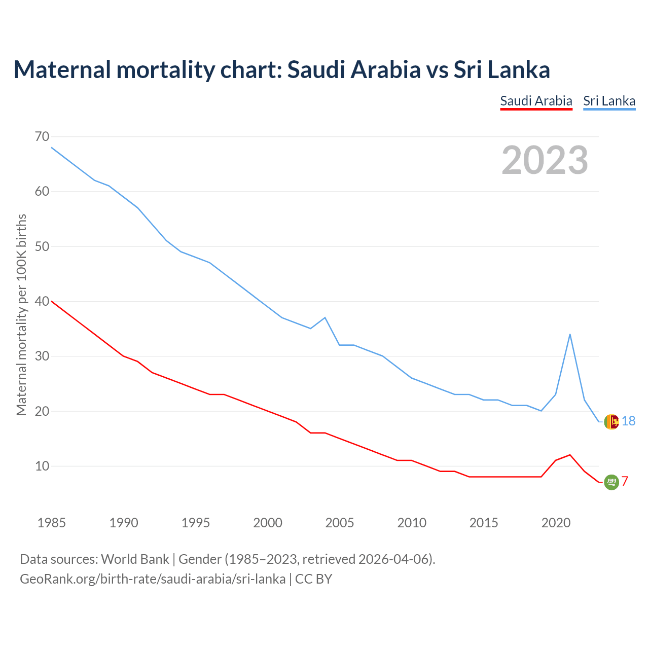 The maternal mortality rate, which is the probability of dying during childbirth or within 42 days of pregnancy termination, is 7 deaths per 100,000 live births in Saudi Arabia, compared to 18 deaths in Sri Lanka.