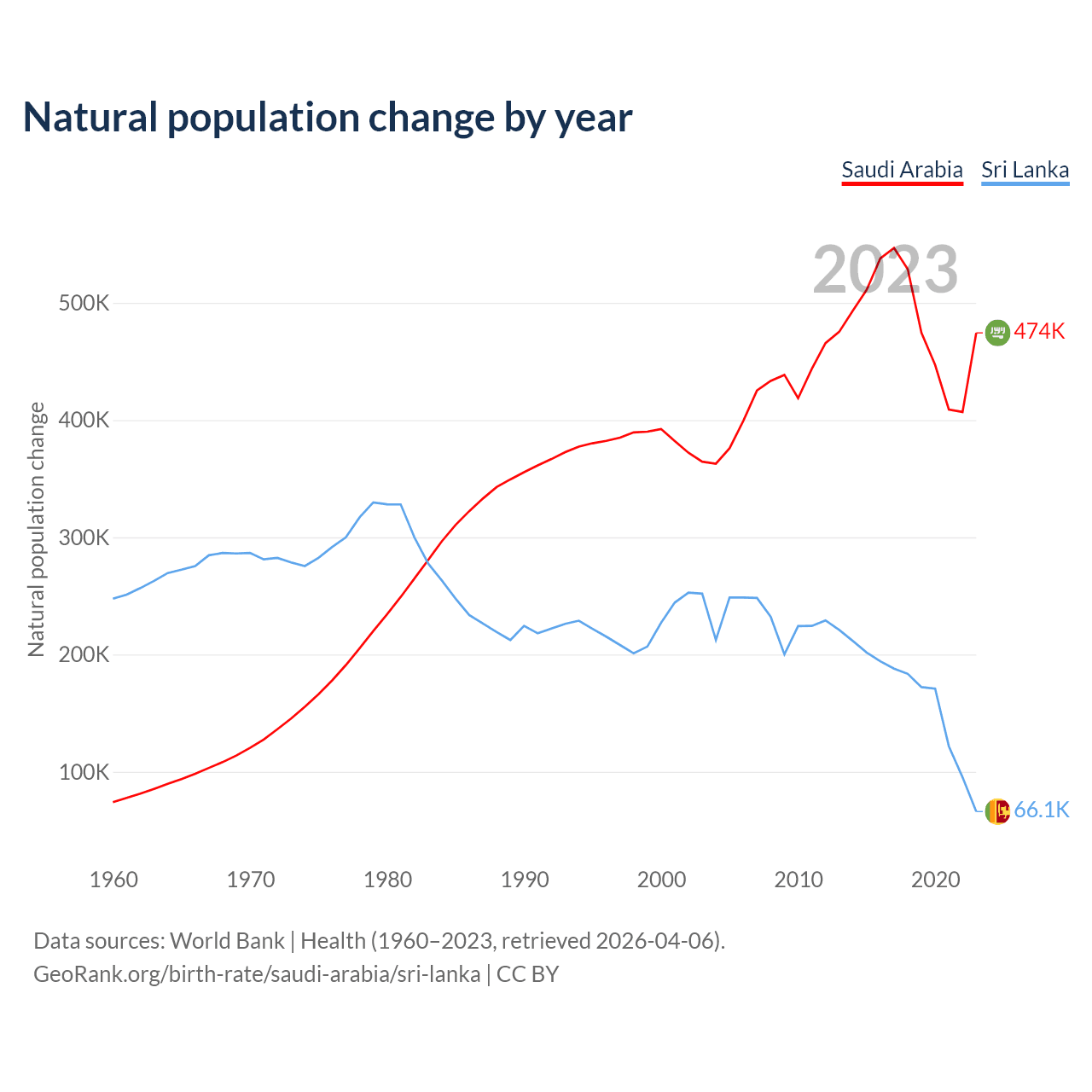 Saudi Arabia has an annual birth rate of 16.4 births per 1,000 people, compared to 11.2 for Sri Lanka. The average number of children a woman is expected to have during her lifetime — the fertility rate, is 2.28 in Saudi Arabia and 1.97 in Sri Lanka — 13.4% difference.