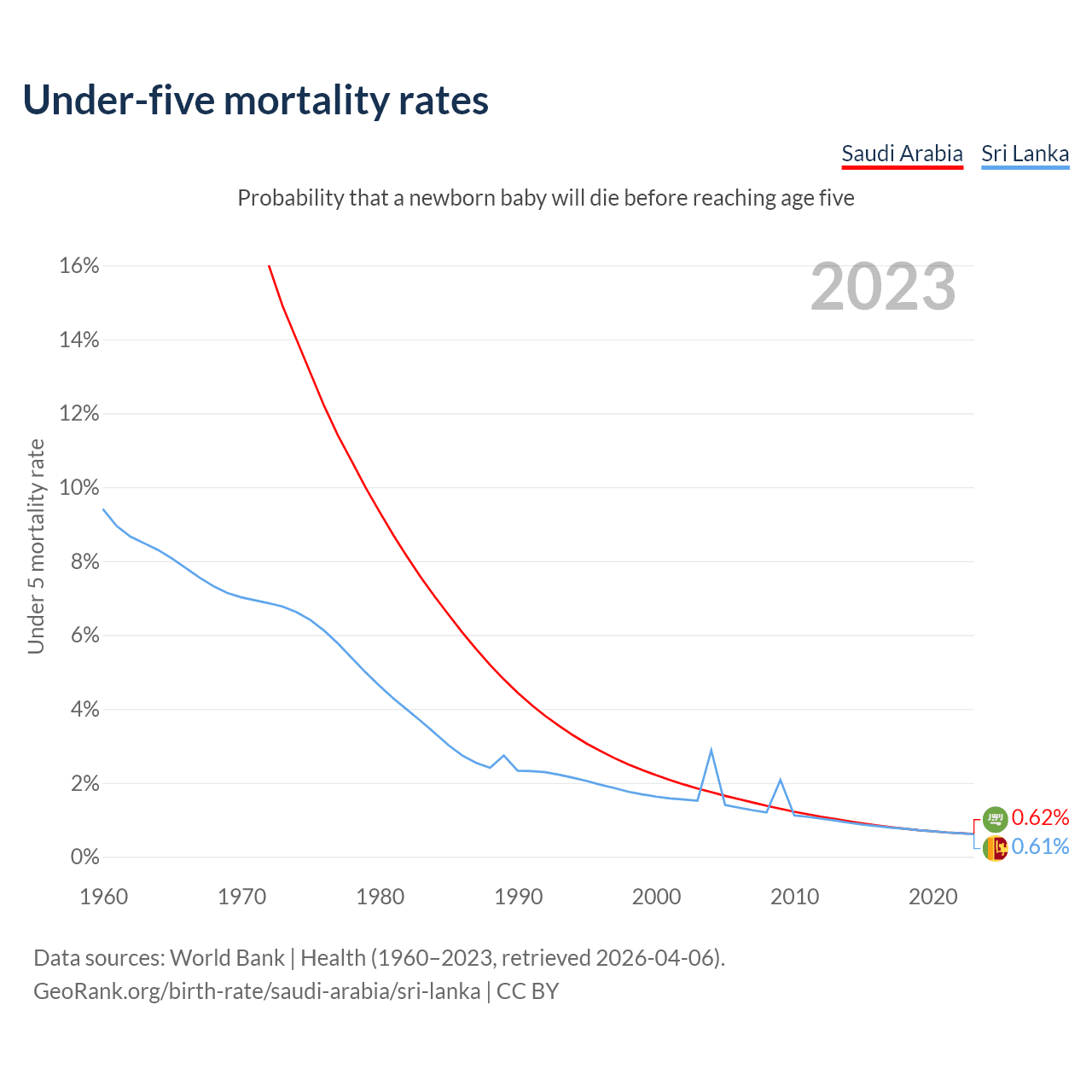 The chance that a newborn baby will die before reaching age five is 0.62% in Saudi Arabia and 0.61% in Sri Lanka. Above is a chart with historical data on under-five mortality rates.