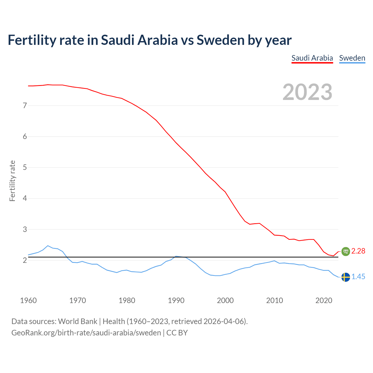 1960 vs 2023, the fertility rate has decreased by 70.1% in Saudi Arabia and by 33.2% in Sweden — in 1960, it was 7.63 and 2.17, respectively.
