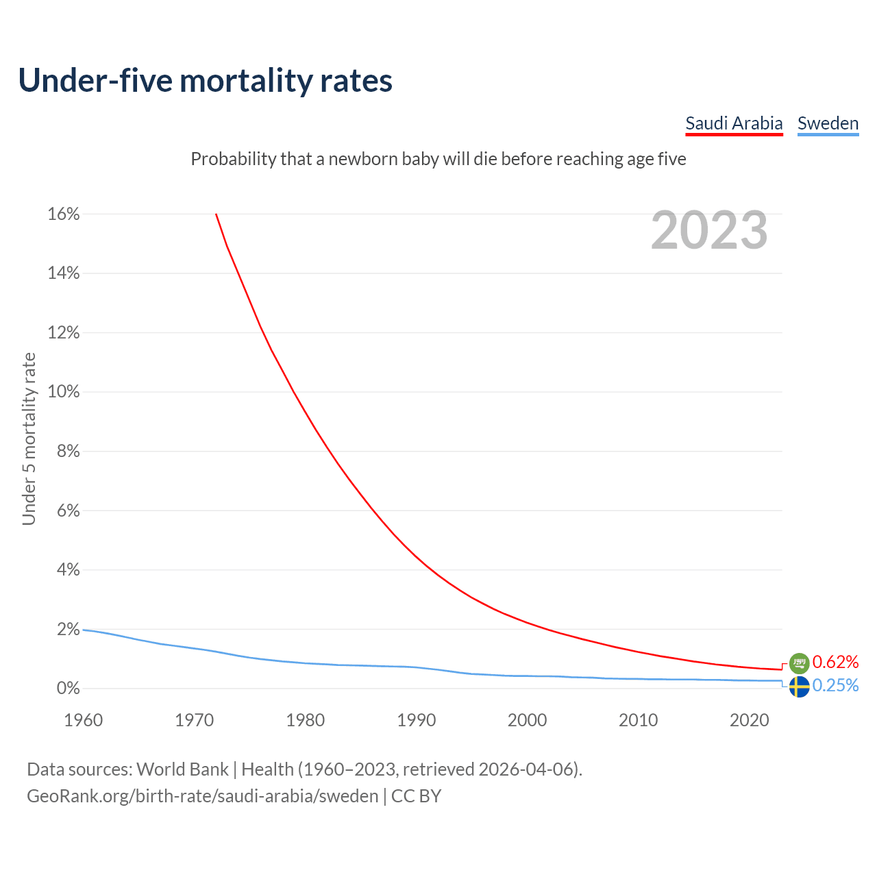 The chance that a newborn baby will die before reaching age five is 0.62% in Saudi Arabia and 0.25% in Sweden. Above is a chart with historical data on under-five mortality rates.