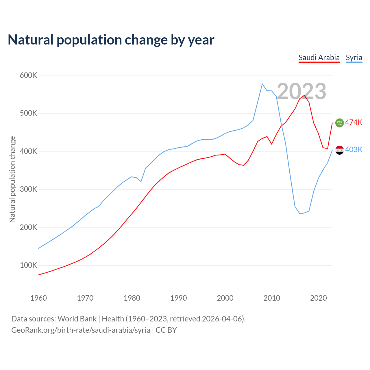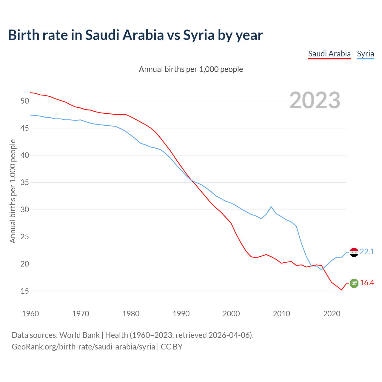 Saudi Arabia has an annual birth rate of 16.4 births per 1,000 people, compared to 22.1 for Syria. The average number of children a woman is expected to have during her lifetime — the fertility rate, is 2.28 in Saudi Arabia and 2.71 in Syria — 18.9% difference.