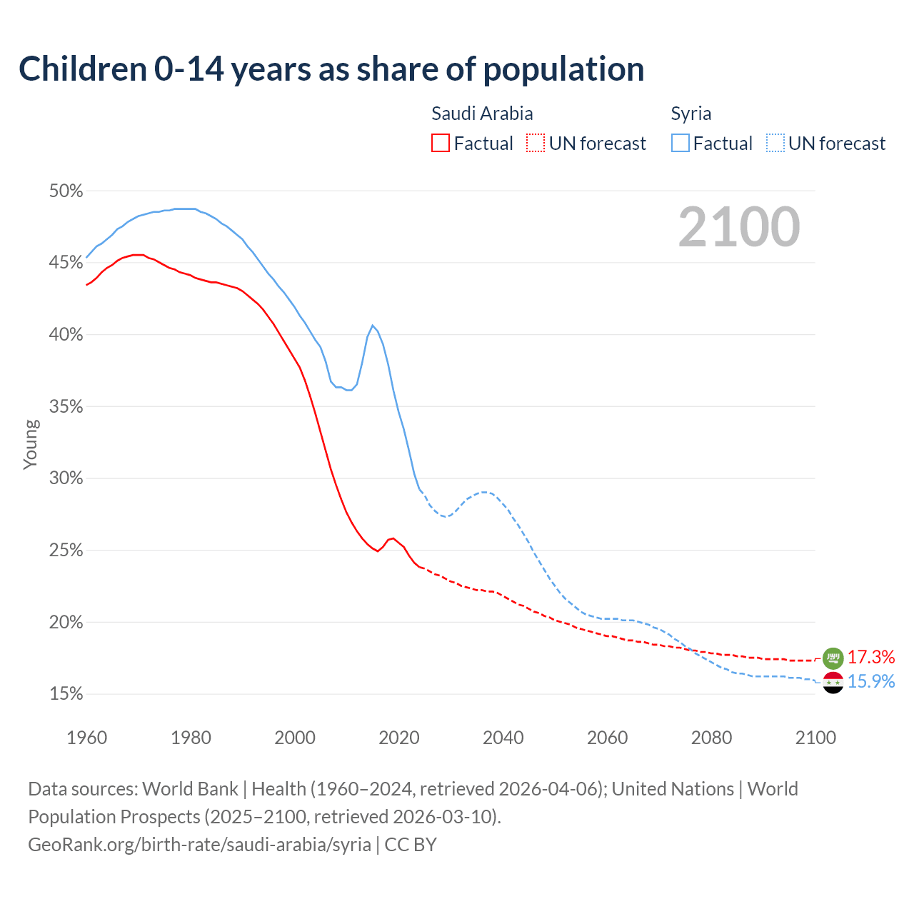According to the latest available data on birth rates, the fertility rate in Saudi Arabia was 2.28 children per woman in 2023, compared to 2.71 in Syria in 2023. The replacement level is considered to be 2.1 children per woman.