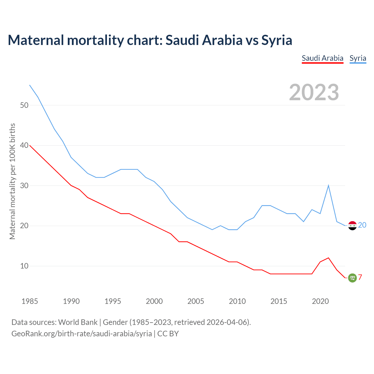 The maternal mortality rate, which is the probability of dying during childbirth or within 42 days of pregnancy termination, is 7 deaths per 100,000 live births in Saudi Arabia, compared to 20 deaths in Syria.