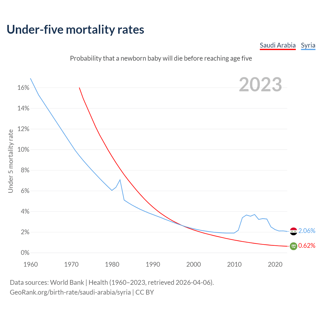 The chance that a newborn baby will die before reaching age five is 0.62% in Saudi Arabia and 2.06% in Syria. Above is a chart with historical data on under-five mortality rates.
