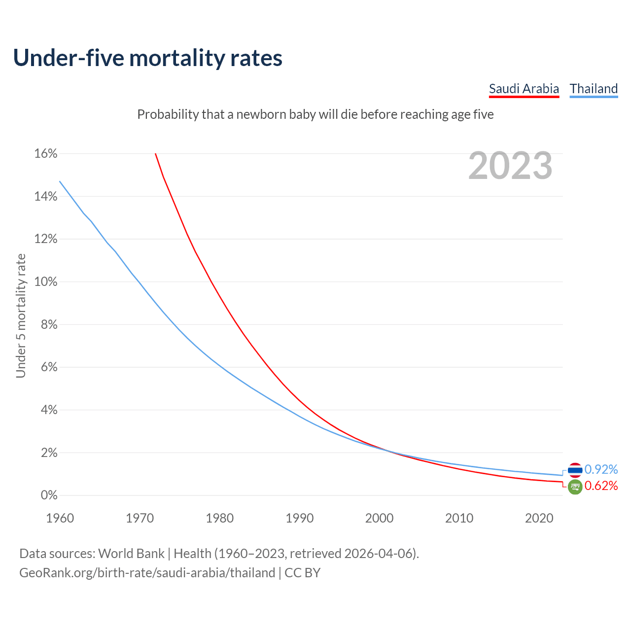 The chance that a newborn baby will die before reaching age five is 0.62% in Saudi Arabia and 0.92% in Thailand. Above is a chart with historical data on under-five mortality rates.