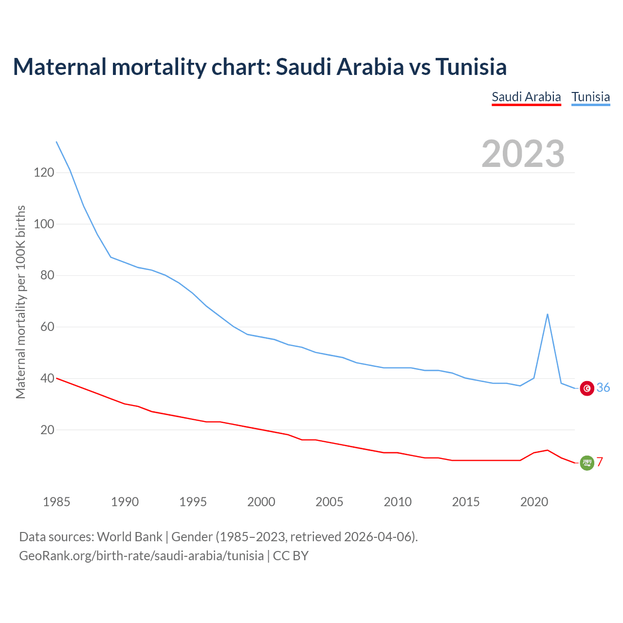 The maternal mortality rate, which is the probability of dying during childbirth or within 42 days of pregnancy termination, is 7 deaths per 100,000 live births in Saudi Arabia, compared to 36 deaths in Tunisia.