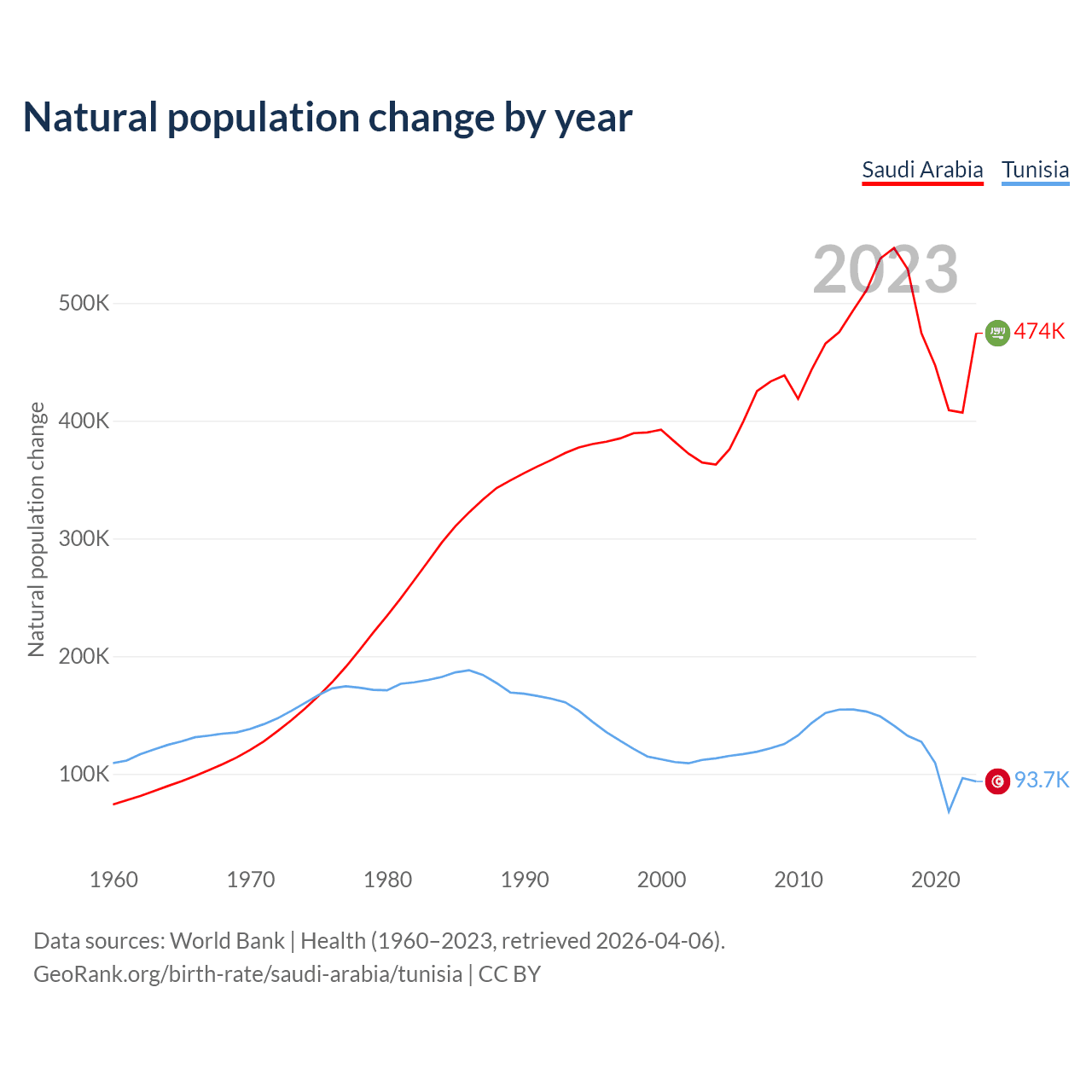 Saudi Arabia has an annual birth rate of 16.4 births per 1,000 people, compared to 13.7 for Tunisia. The average number of children a woman is expected to have during her lifetime — the fertility rate, is 2.28 in Saudi Arabia and 1.83 in Tunisia — 19.6% difference.