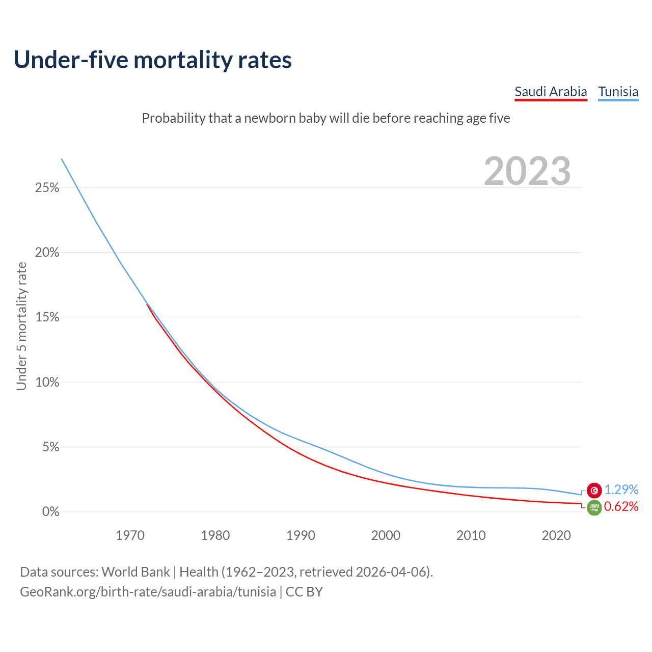 The chance that a newborn baby will die before reaching age five is 0.62% in Saudi Arabia and 1.29% in Tunisia. Above is a chart with historical data on under-five mortality rates.