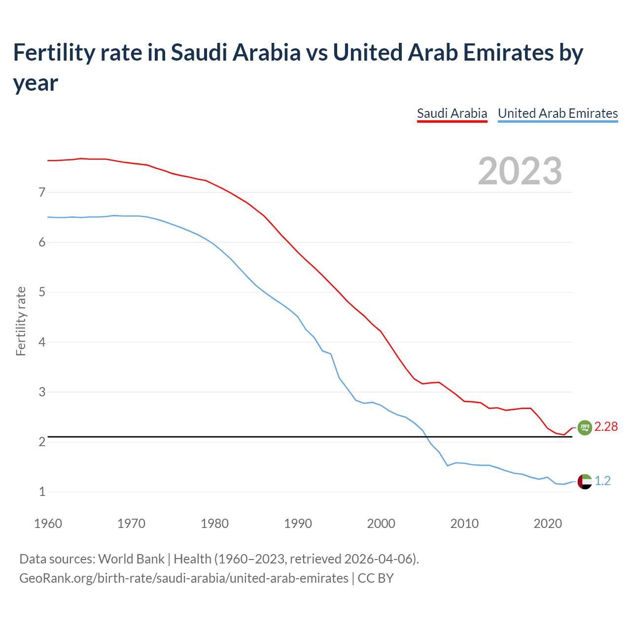 1960 vs 2023, the fertility rate has decreased by 70.1% in Saudi Arabia and by 81.5% in the United Arab Emirates — in 1960, it was 7.63 and 6.5, respectively.