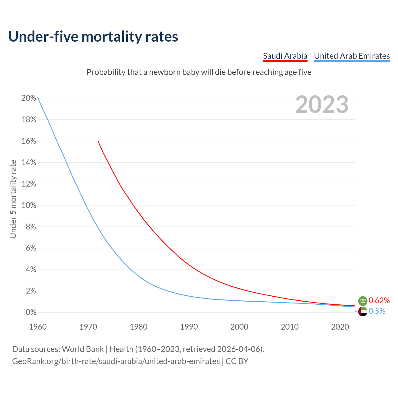 The chance that a newborn baby will die before reaching age five is 0.62% in Saudi Arabia and 0.5% in the United Arab Emirates. Above is a chart with historical data on under-five mortality rates.