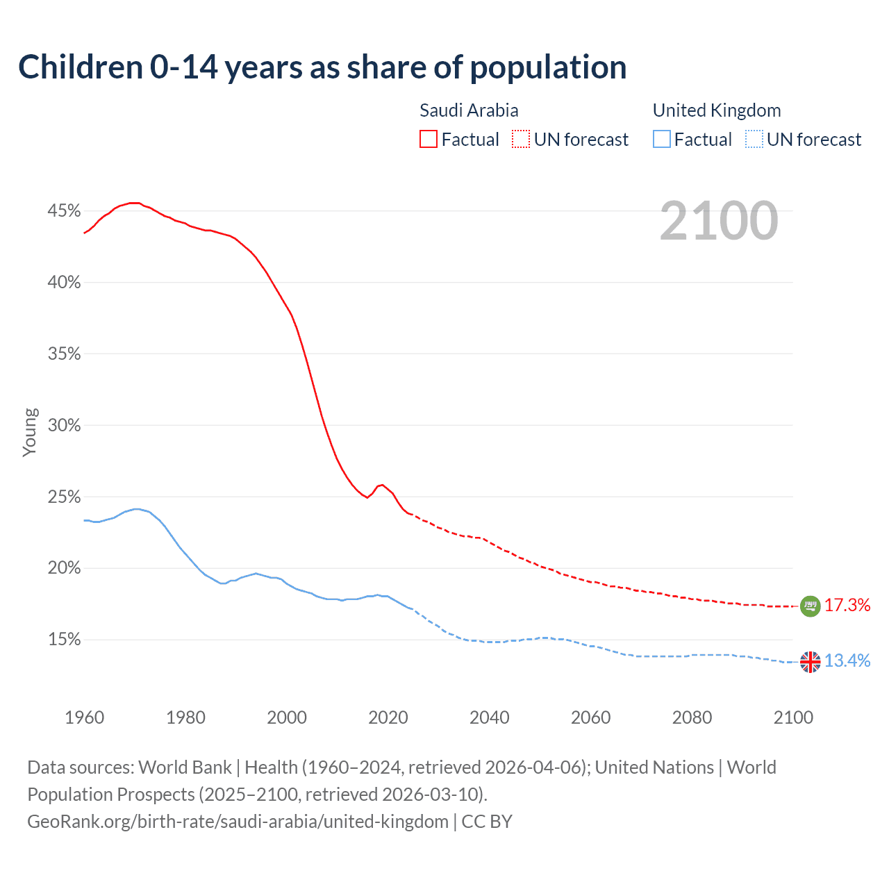 According to the latest available data on birth rates, the fertility rate in Saudi Arabia was 2.28 children per woman in 2023, compared to 1.56 in the United Kingdom in 2023. The replacement level is considered to be 2.1 children per woman.