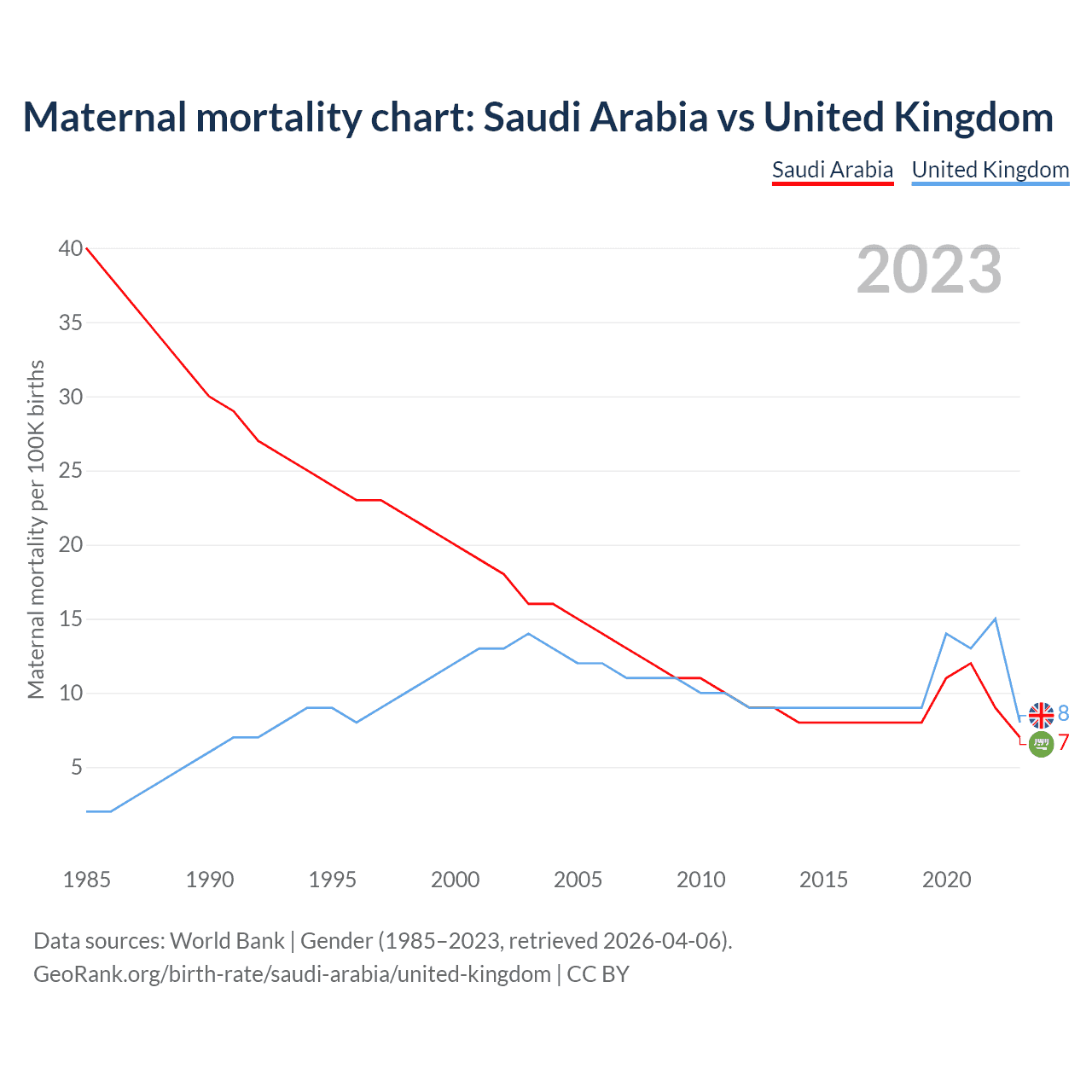 The maternal mortality rate, which is the probability of dying during childbirth or within 42 days of pregnancy termination, is 7 deaths per 100,000 live births in Saudi Arabia, compared to 8 deaths in the United Kingdom.