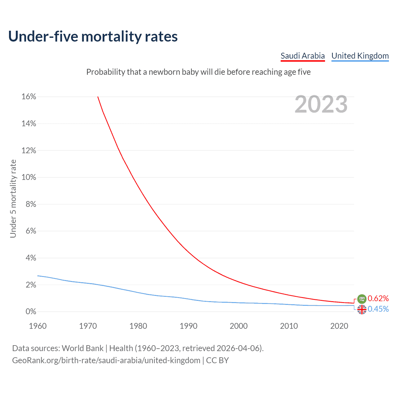 The chance that a newborn baby will die before reaching age five is 0.62% in Saudi Arabia and 0.45% in the United Kingdom. Above is a chart with historical data on under-five mortality rates.