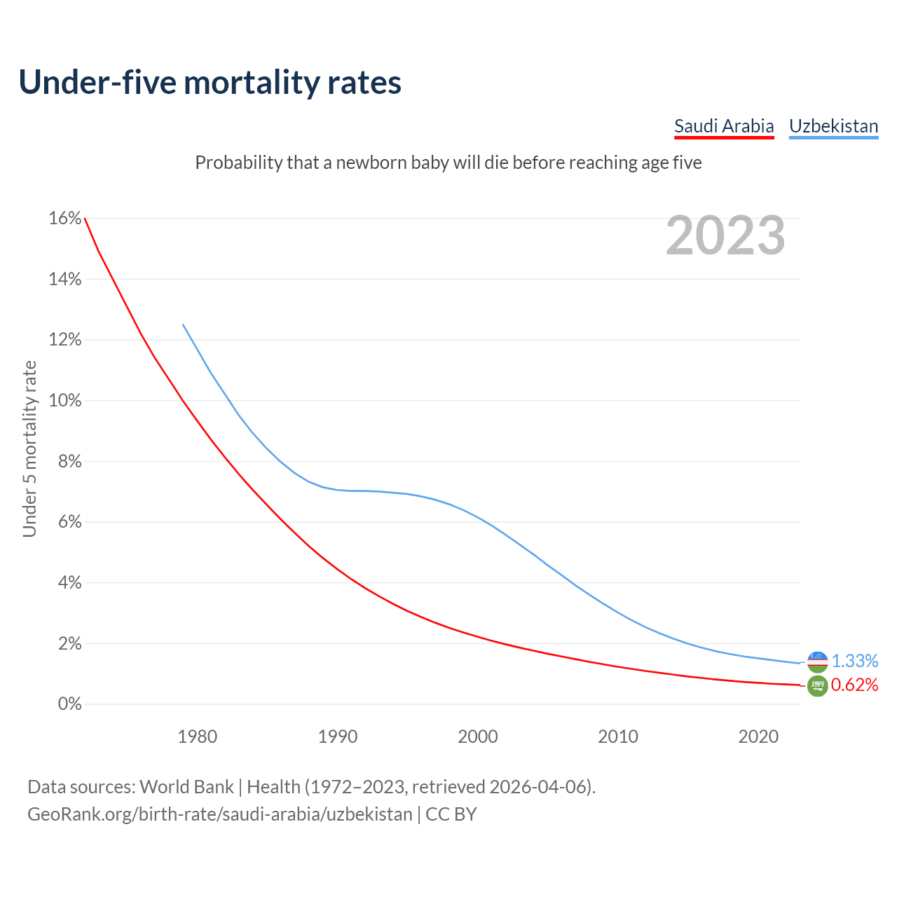 The chance that a newborn baby will die before reaching age five is 0.62% in Saudi Arabia and 1.33% in Uzbekistan. Above is a chart with historical data on under-five mortality rates.