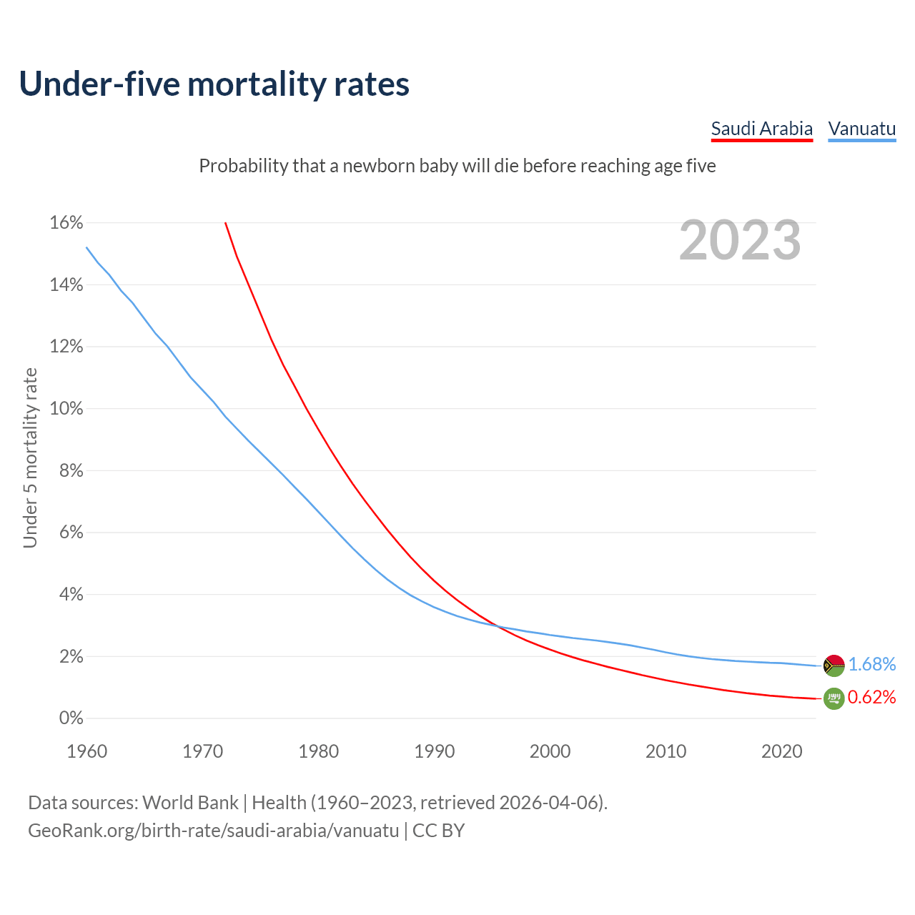 The chance that a newborn baby will die before reaching age five is 0.62% in Saudi Arabia and 1.68% in Vanuatu. Above is a chart with historical data on under-five mortality rates.