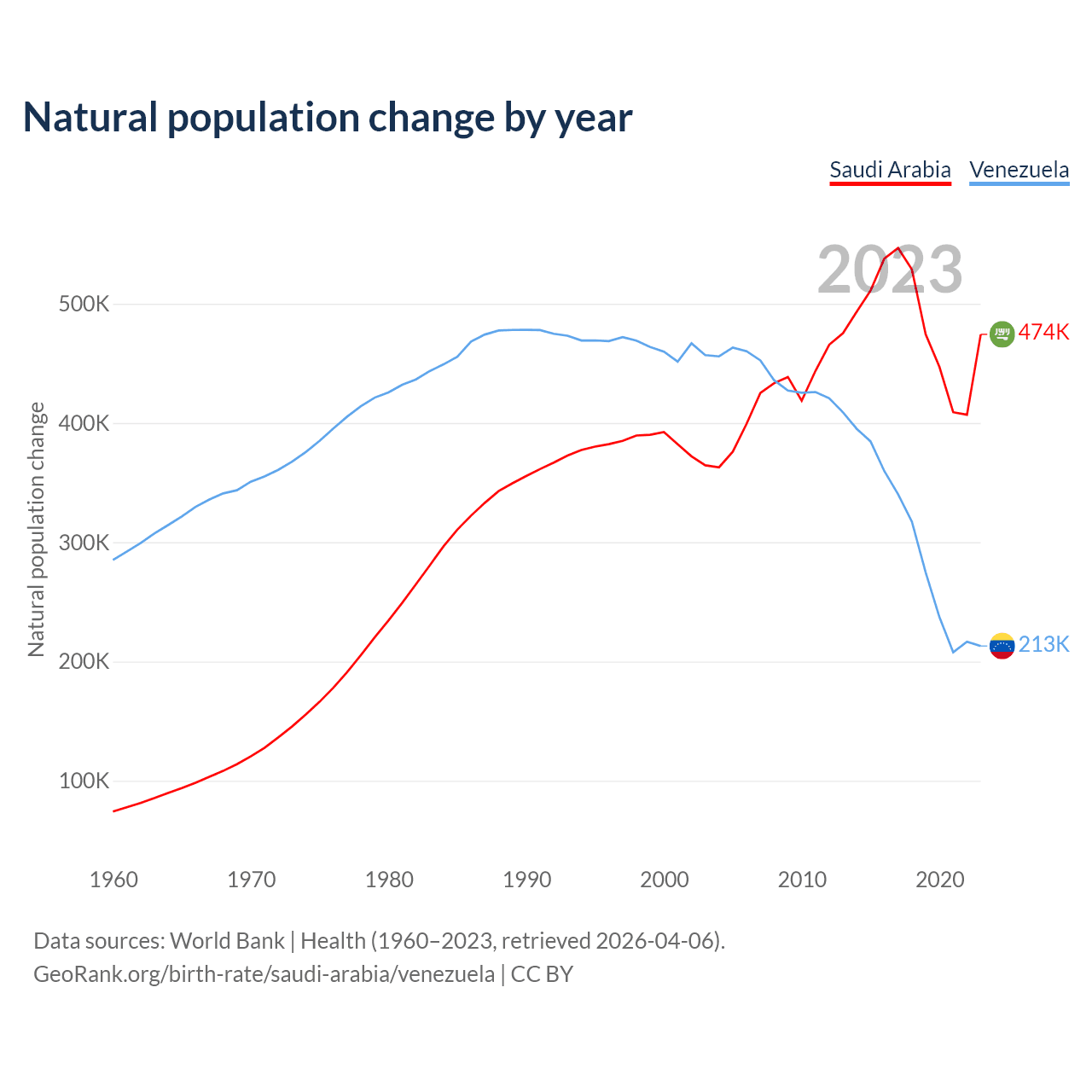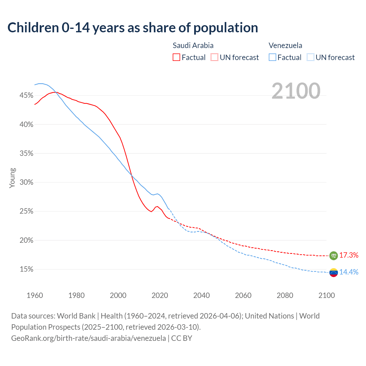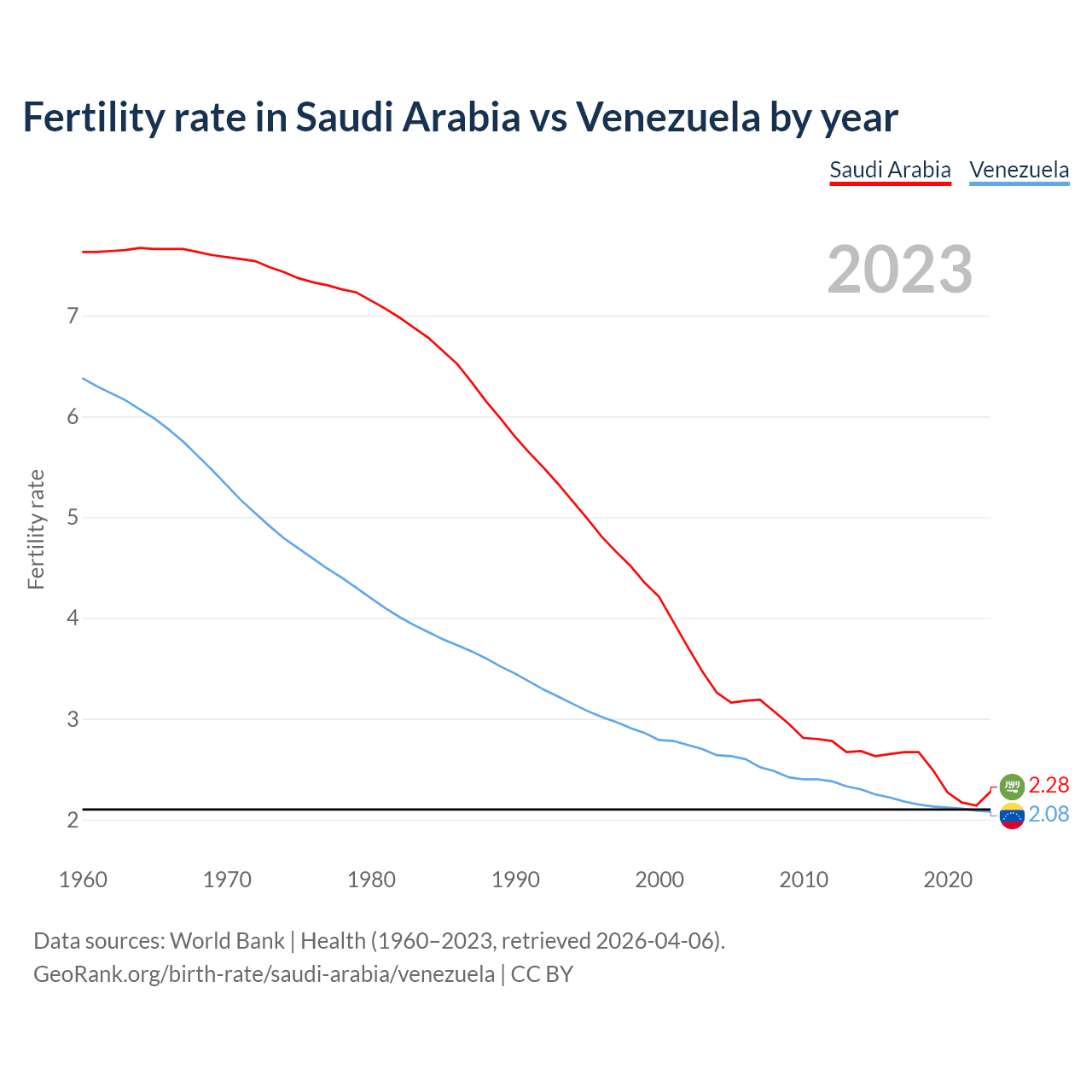 According to the latest available data on birth rates, the fertility rate in Saudi Arabia was 2.28 children per woman in 2023, compared to 2.08 in Venezuela in 2023. The replacement level is considered to be 2.1 children per woman.