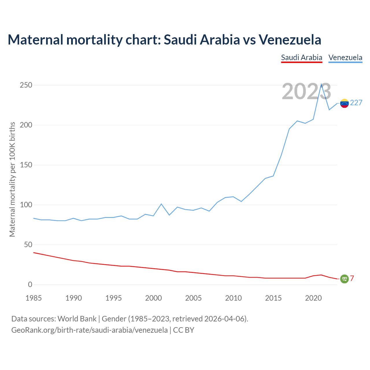 The maternal mortality rate, which is the probability of dying during childbirth or within 42 days of pregnancy termination, is 7 deaths per 100,000 live births in Saudi Arabia, compared to 227 deaths in Venezuela.