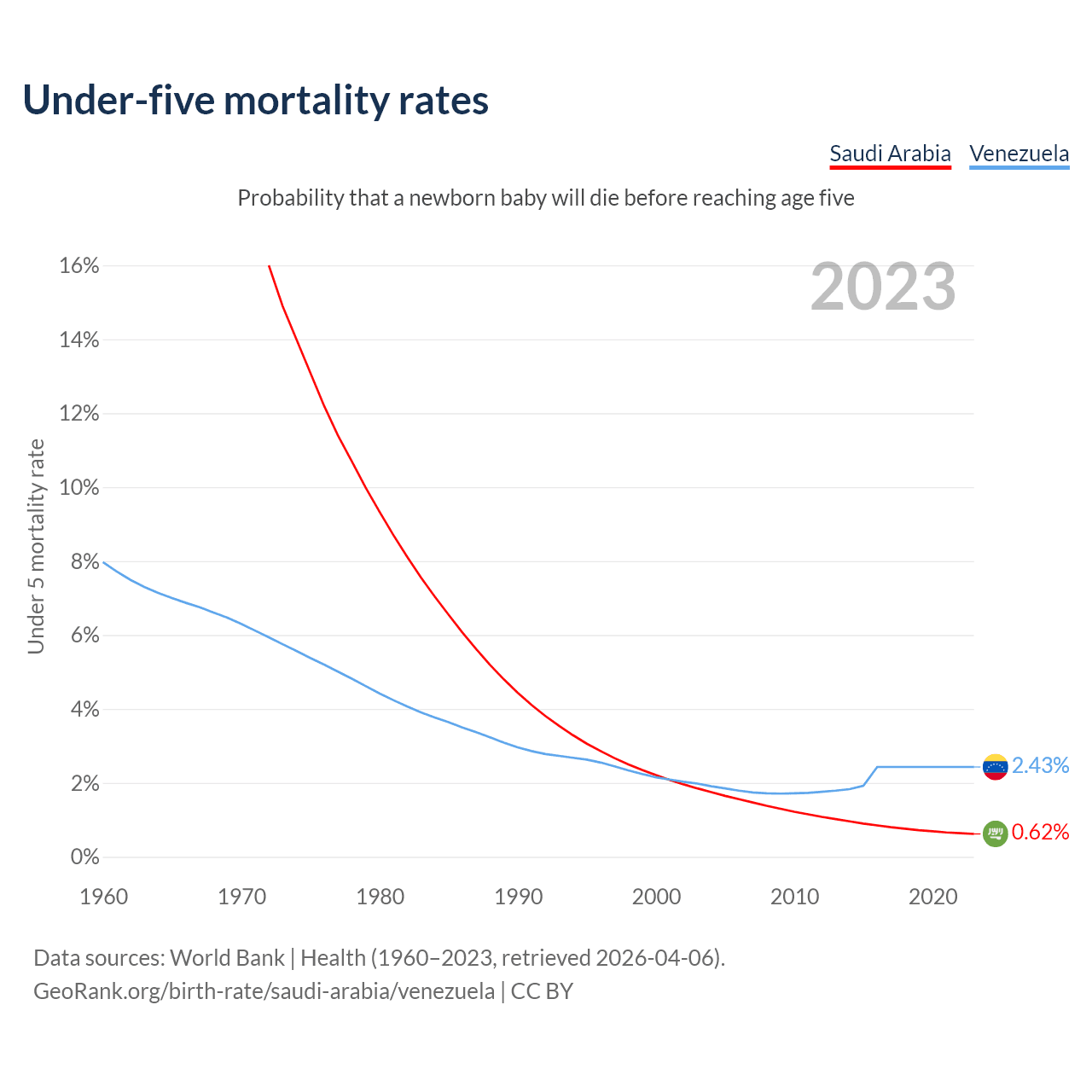 The chance that a newborn baby will die before reaching age five is 0.62% in Saudi Arabia and 2.43% in Venezuela. Above is a chart with historical data on under-five mortality rates.