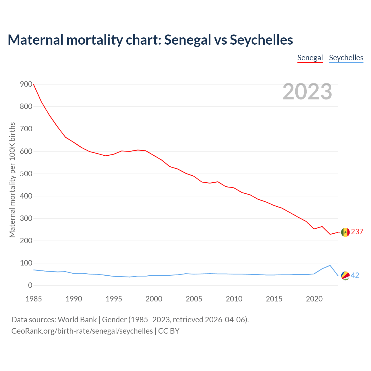 - Annual births per 1,000 women ages 15-19 (adolescent birth rate or teenage mother rate) is 60.2 in Senegal vs 54.5 in the Seychelles.