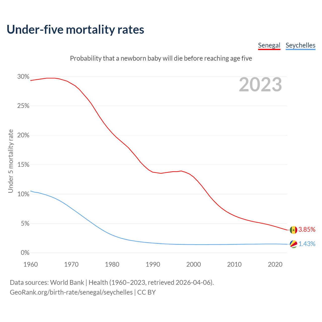 The chance that a newborn baby will die before reaching age five is 3.85% in Senegal and 1.43% in the Seychelles. Above is a chart with historical data on under-five mortality rates.