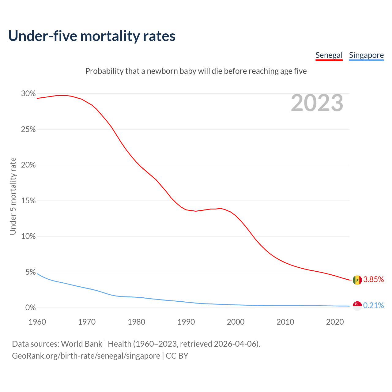 The chance that a newborn baby will die before reaching age five is 3.85% in Senegal and 0.21% in Singapore. Above is a chart with historical data on under-five mortality rates.
