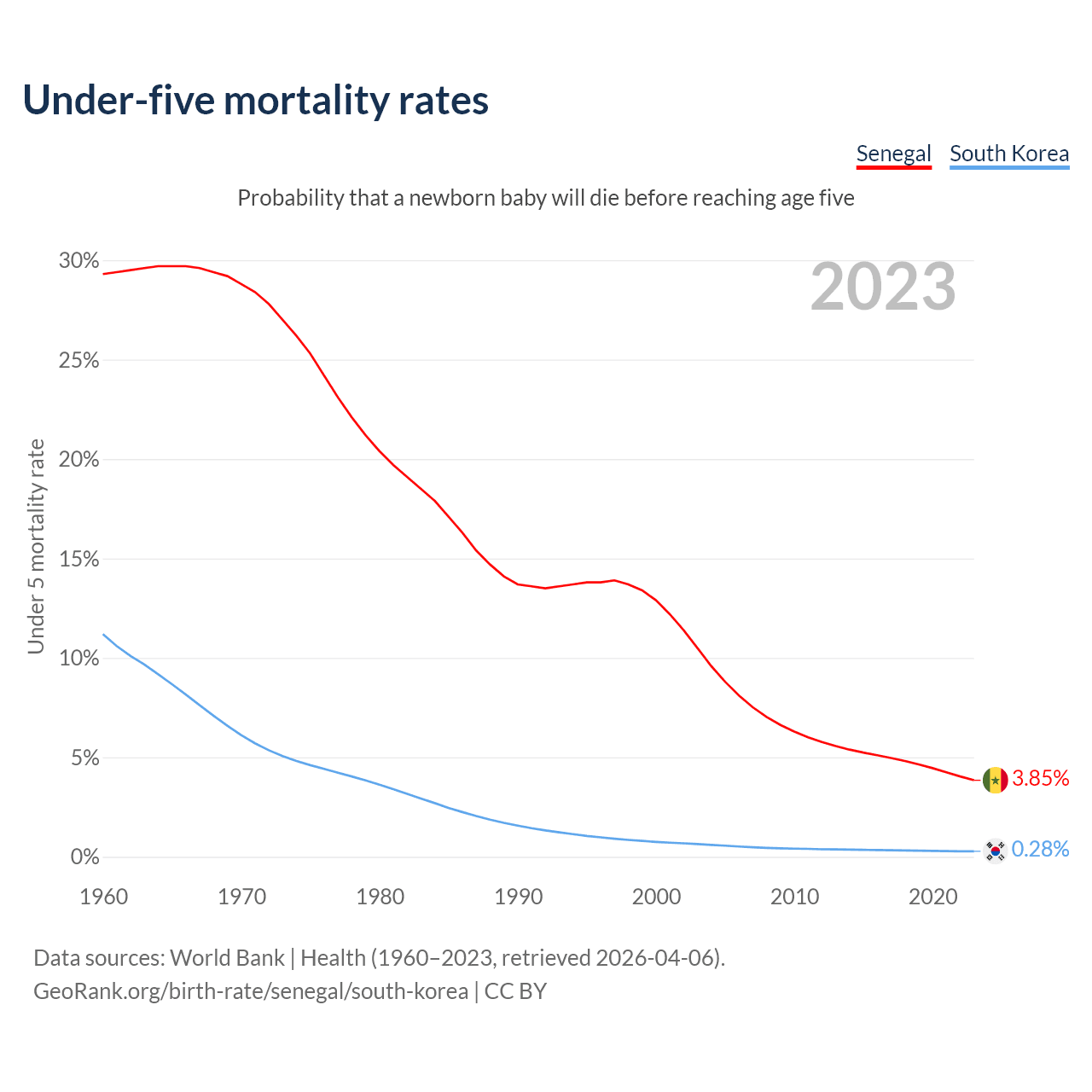 The chance that a newborn baby will die before reaching age five is 3.85% in Senegal and 0.28% in South Korea. Above is a chart with historical data on under-five mortality rates.