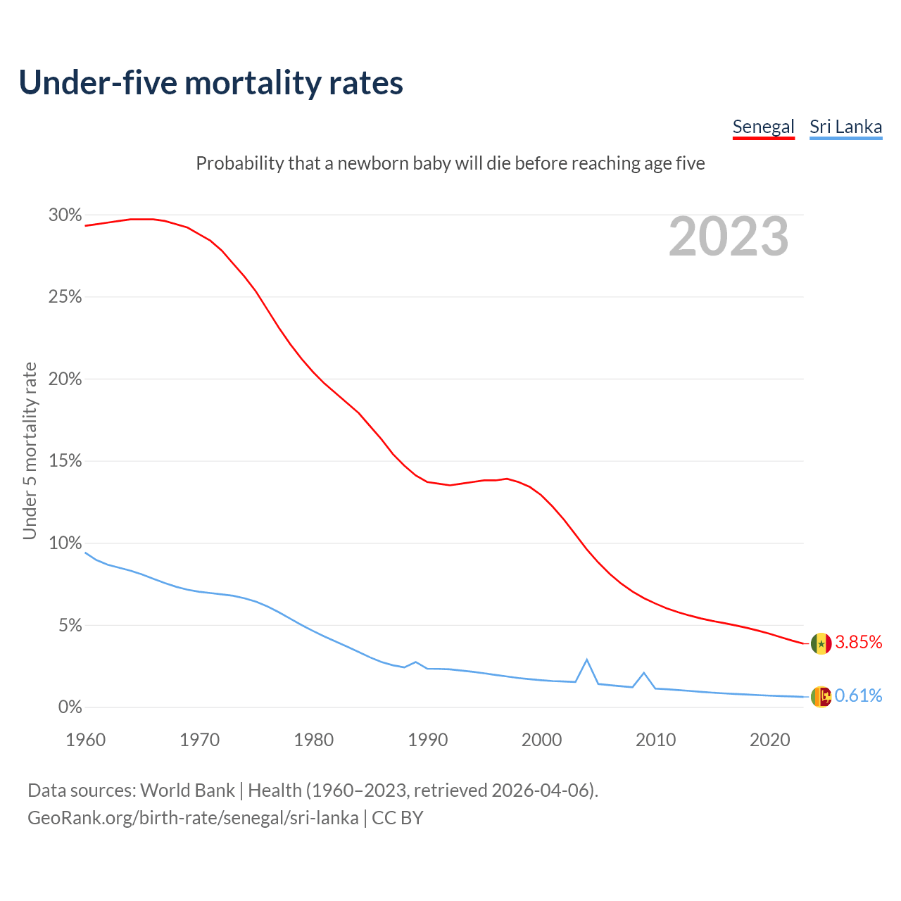 The chance that a newborn baby will die before reaching age five is 3.85% in Senegal and 0.61% in Sri Lanka. Above is a chart with historical data on under-five mortality rates.