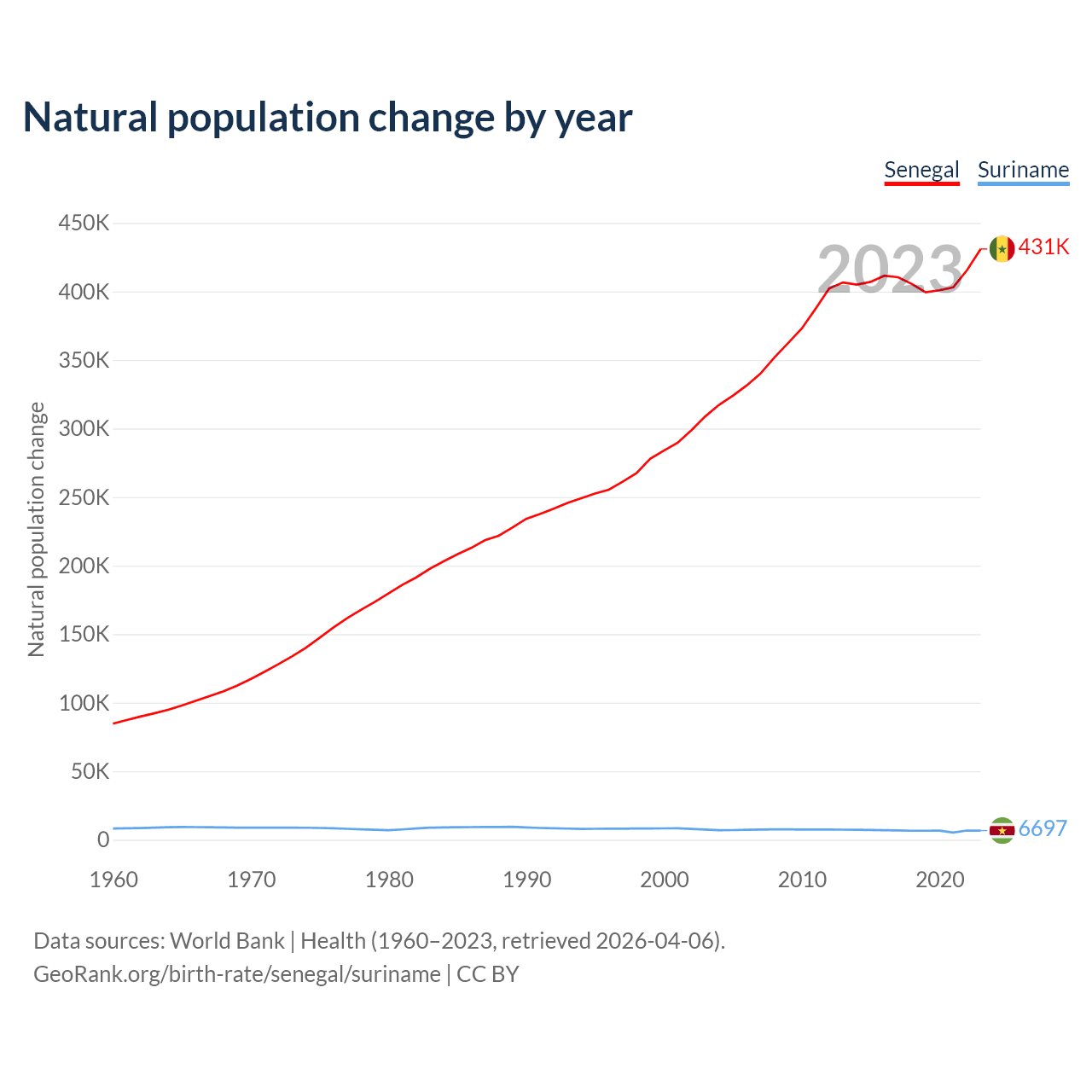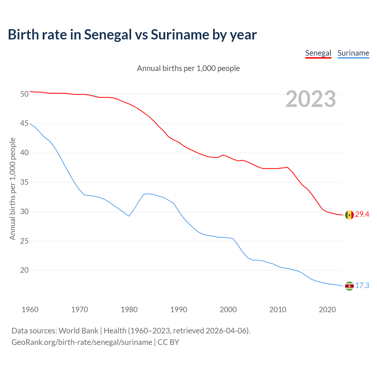 Senegal has an annual birth rate of 29.4 births per 1,000 people, compared to 17.3 for Suriname. The average number of children a woman is expected to have during her lifetime — the fertility rate, is 3.82 in Senegal and 2.25 in Suriname — 41.1% difference.