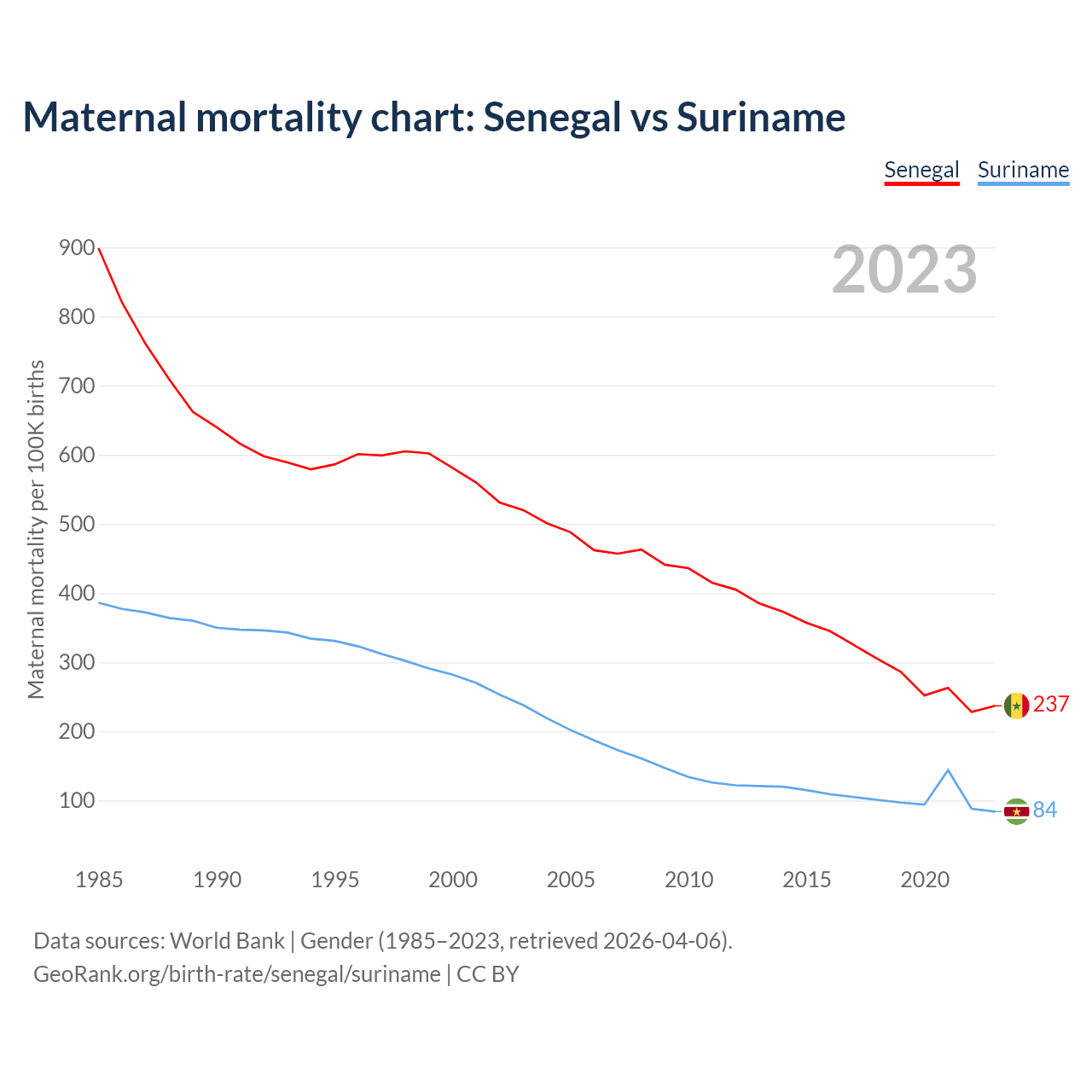 The maternal mortality rate, which is the probability of dying during childbirth or within 42 days of pregnancy termination, is 237 deaths per 100,000 live births in Senegal, compared to 84 deaths in Suriname.