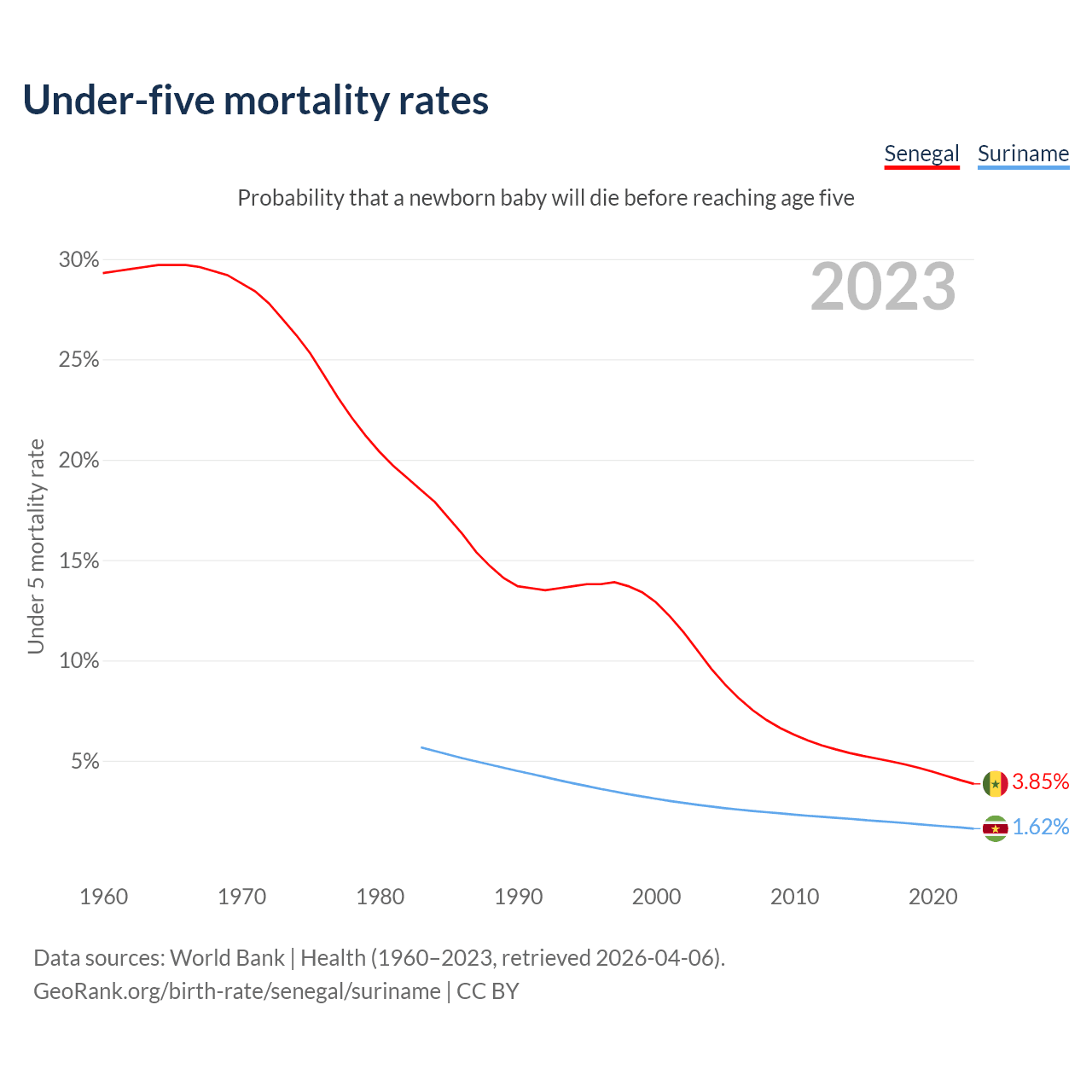 The chance that a newborn baby will die before reaching age five is 3.85% in Senegal and 1.62% in Suriname. Above is a chart with historical data on under-five mortality rates.
