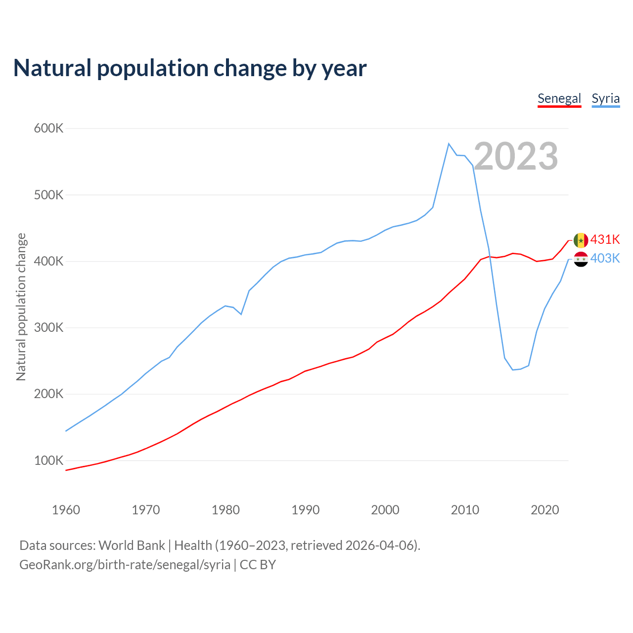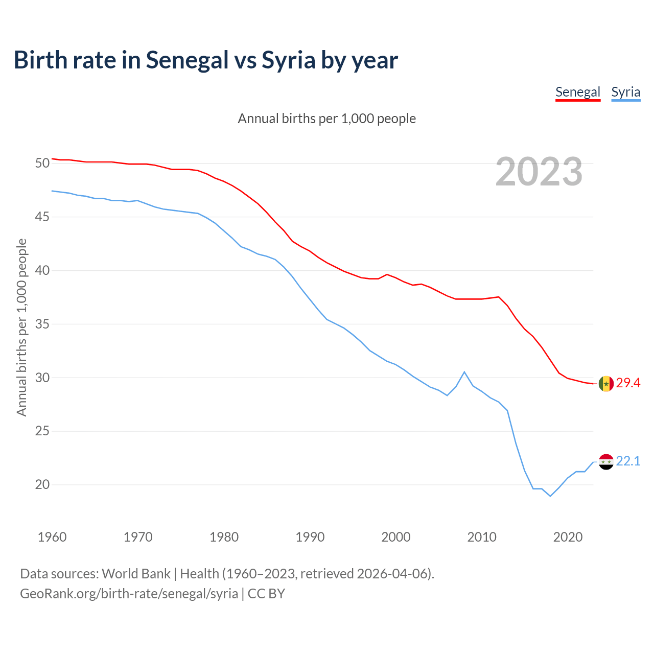 Senegal has an annual birth rate of 29.4 births per 1,000 people, compared to 22.1 for Syria. The average number of children a woman is expected to have during her lifetime — the fertility rate, is 3.82 in Senegal and 2.71 in Syria — 29% difference.