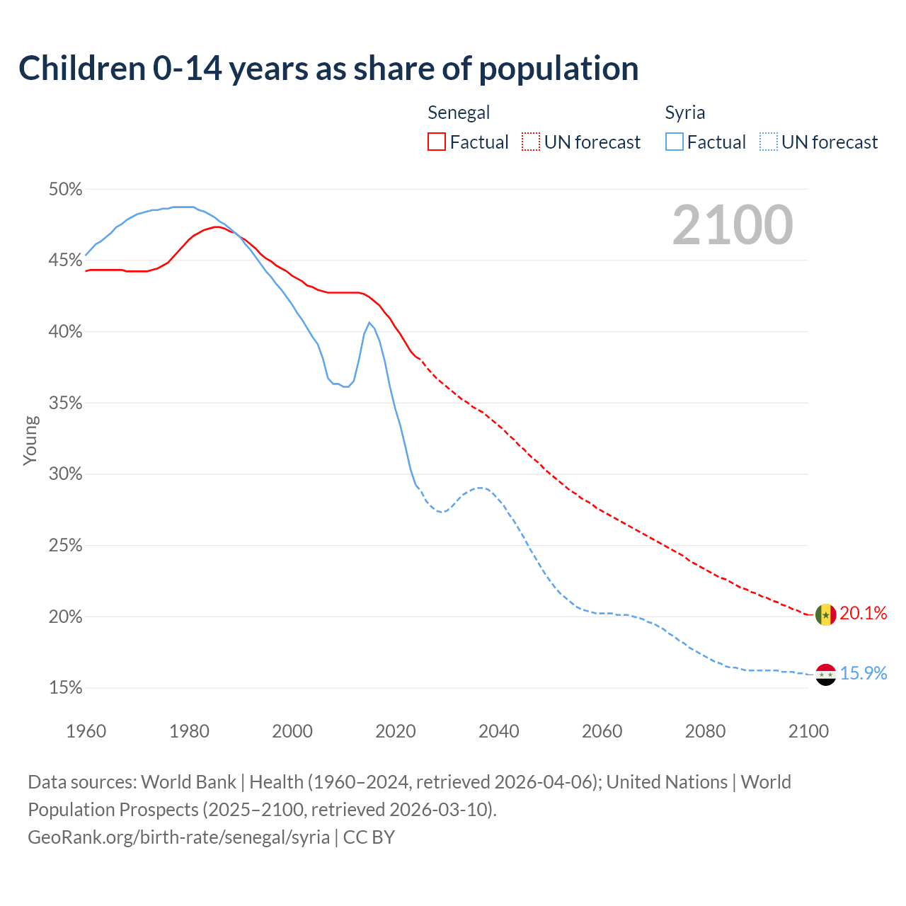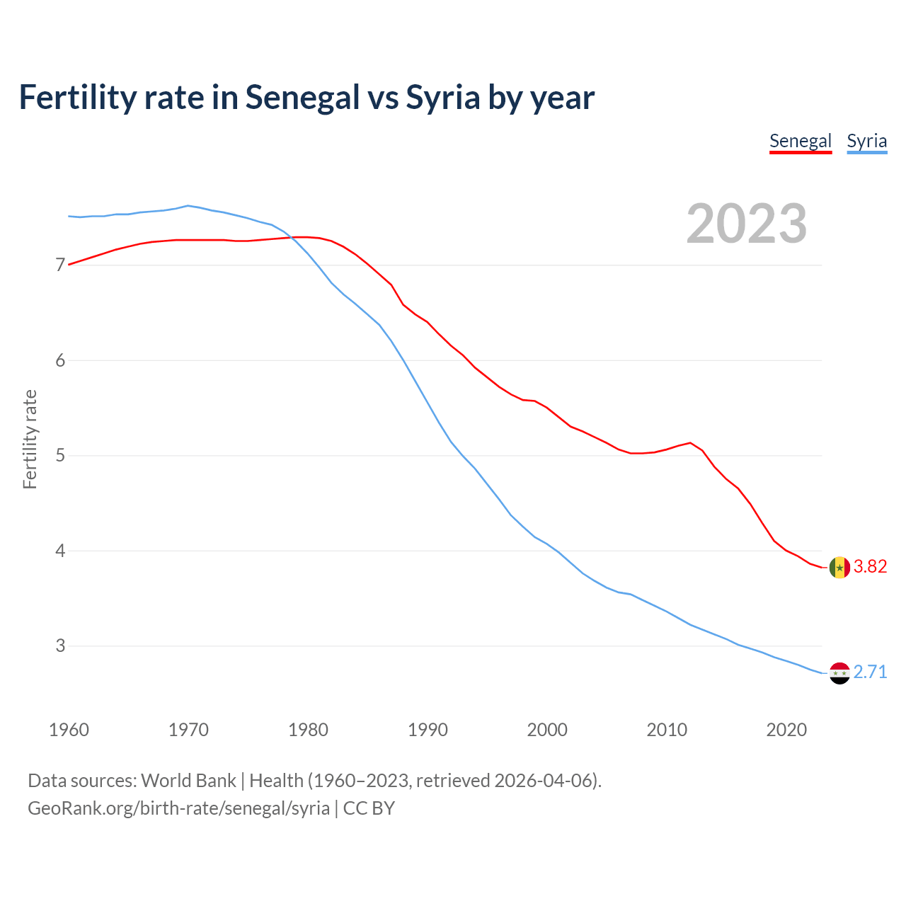 According to the latest available data on birth rates, the fertility rate in Senegal was 3.82 children per woman in 2023, compared to 2.71 in Syria in 2023. The replacement level is considered to be 2.1 children per woman.