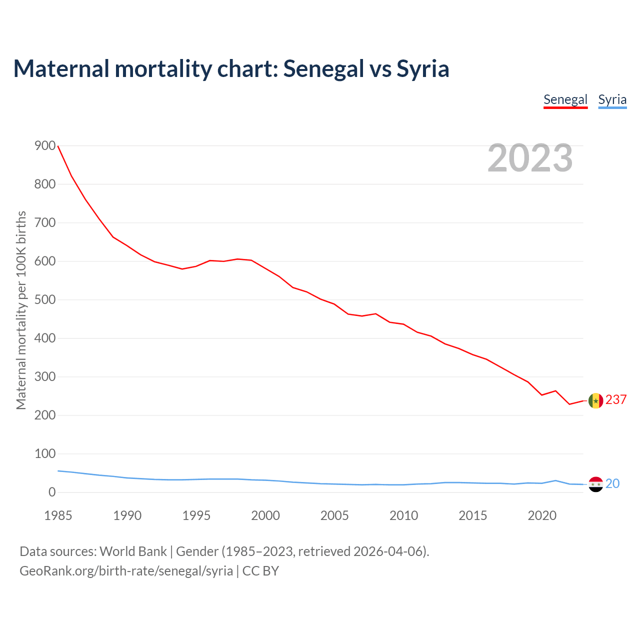 The maternal mortality rate, which is the probability of dying during childbirth or within 42 days of pregnancy termination, is 237 deaths per 100,000 live births in Senegal, compared to 20 deaths in Syria.