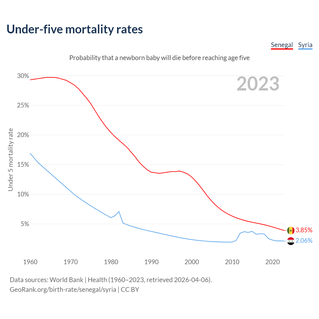 The chance that a newborn baby will die before reaching age five is 3.85% in Senegal and 2.06% in Syria. Above is a chart with historical data on under-five mortality rates.
