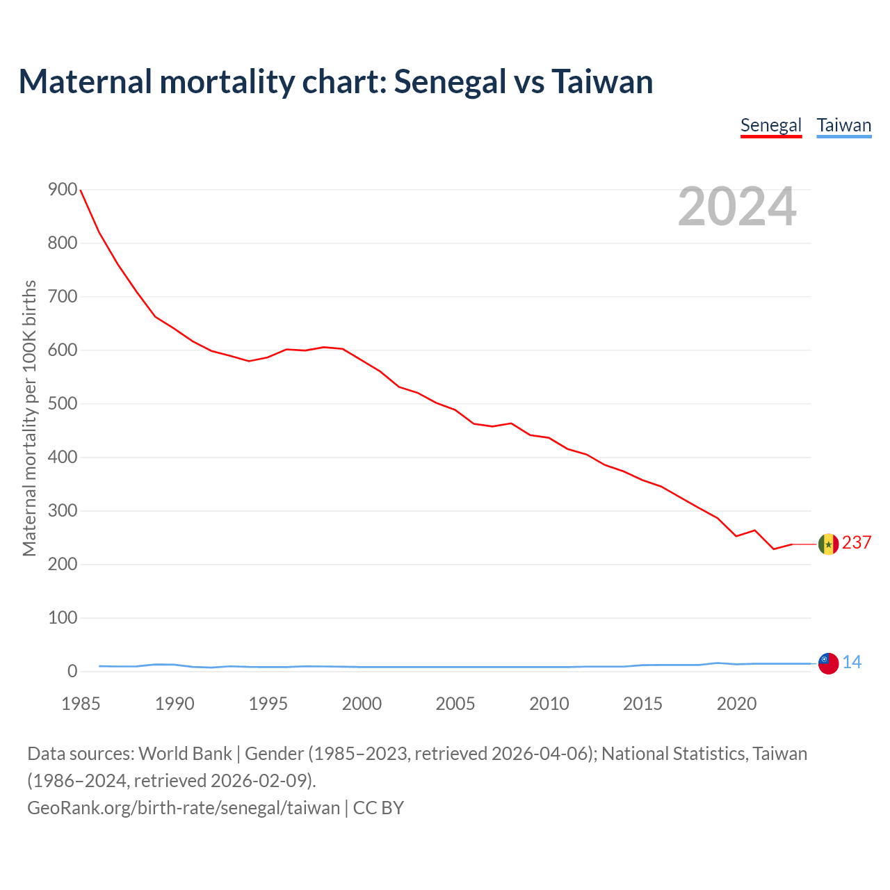 The maternal mortality rate, which is the probability of dying during childbirth or within 42 days of pregnancy termination, is 237 deaths per 100,000 live births in Senegal, compared to 14 deaths in Taiwan.