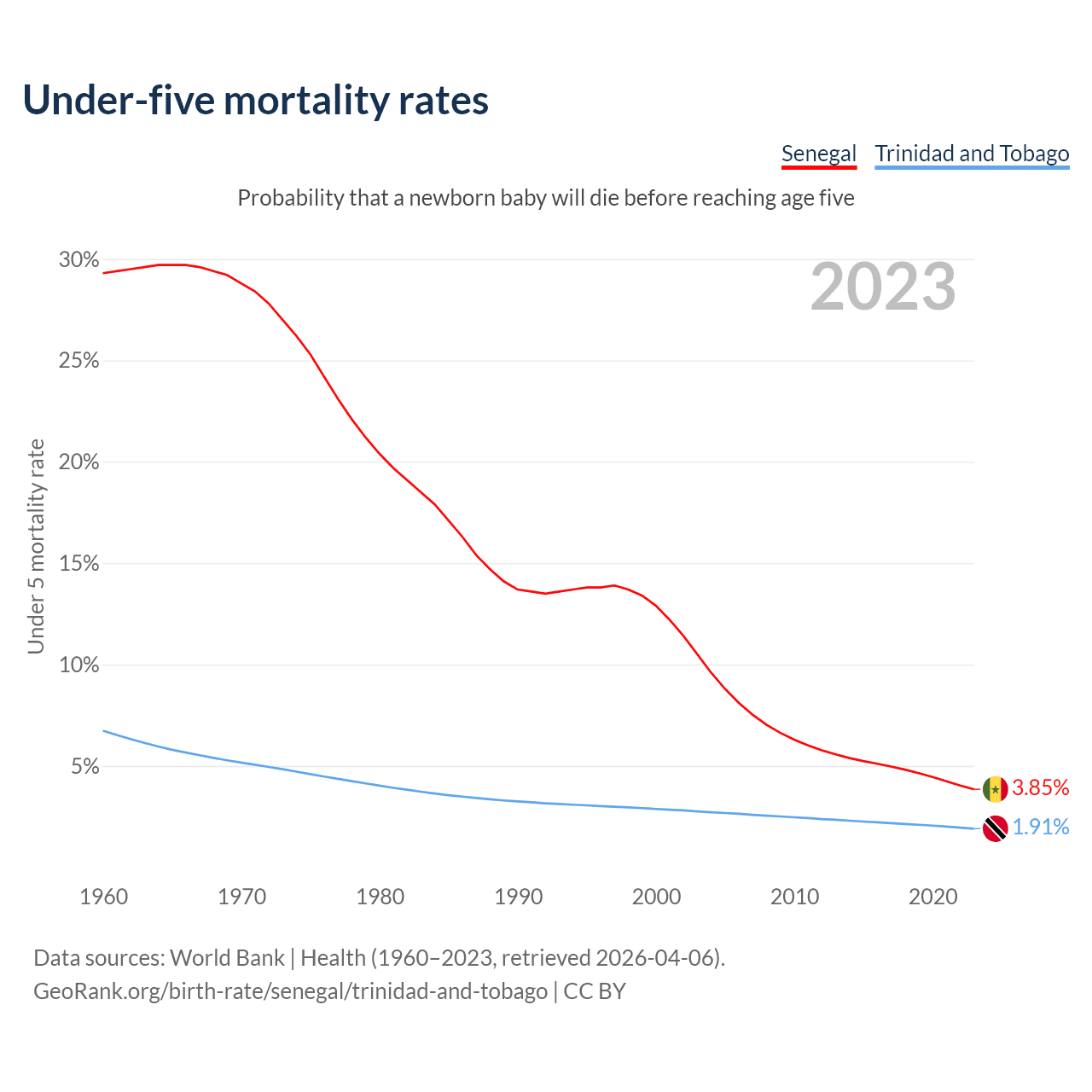 The chance that a newborn baby will die before reaching age five is 3.85% in Senegal and 1.91% in Trinidad and Tobago. Above is a chart with historical data on under-five mortality rates.