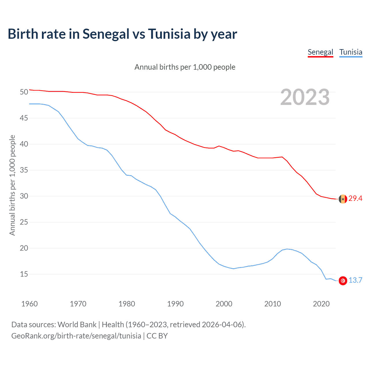 Senegal has an annual birth rate of 29.4 births per 1,000 people, compared to 13.7 for Tunisia. The average number of children a woman is expected to have during her lifetime — the fertility rate, is 3.82 in Senegal and 1.83 in Tunisia — 52% difference.
