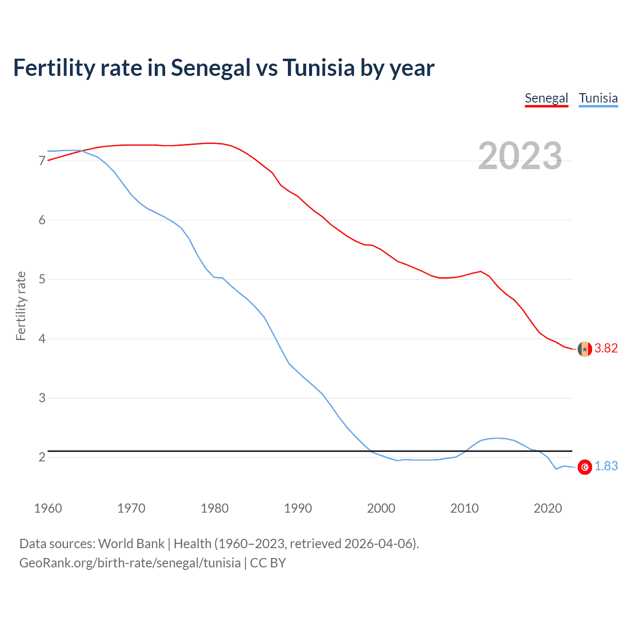 According to the latest available data on birth rates, the fertility rate in Senegal was 3.82 children per woman in 2023, compared to 1.83 in Tunisia in 2023. The replacement level is considered to be 2.1 children per woman.