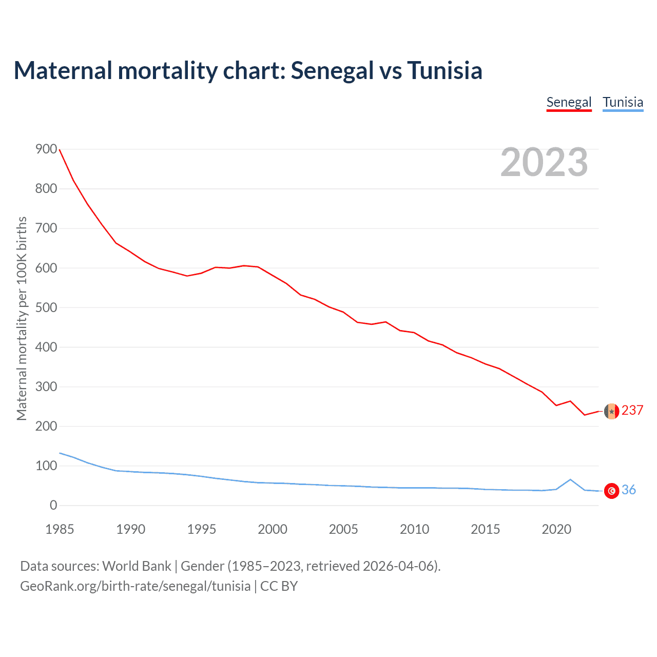 The maternal mortality rate, which is the probability of dying during childbirth or within 42 days of pregnancy termination, is 237 deaths per 100,000 live births in Senegal, compared to 36 deaths in Tunisia.