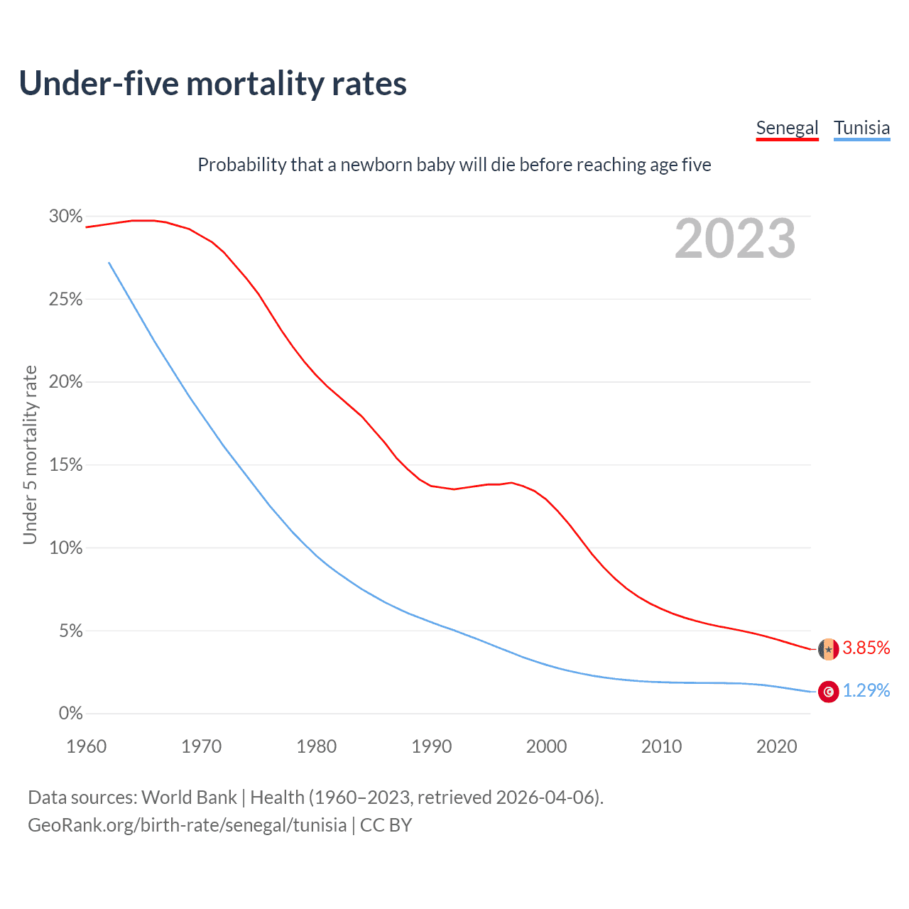 The chance that a newborn baby will die before reaching age five is 3.85% in Senegal and 1.29% in Tunisia. Above is a chart with historical data on under-five mortality rates.