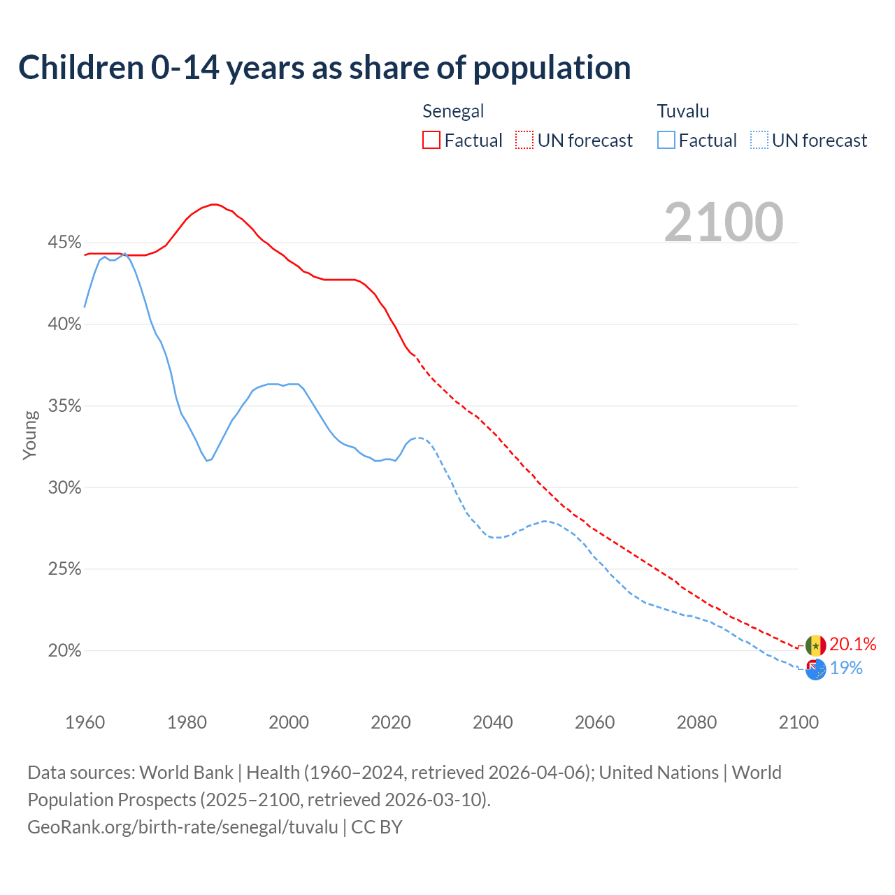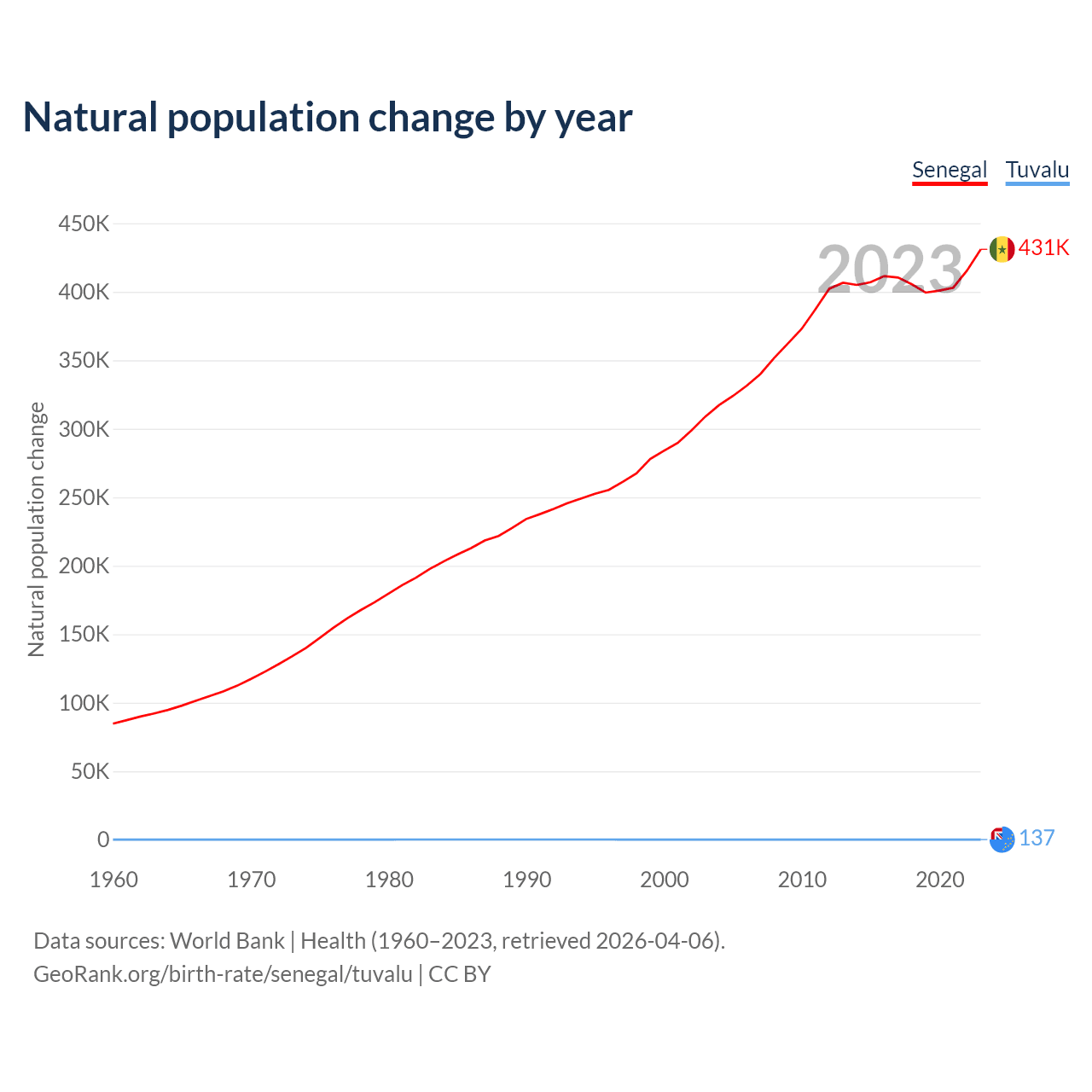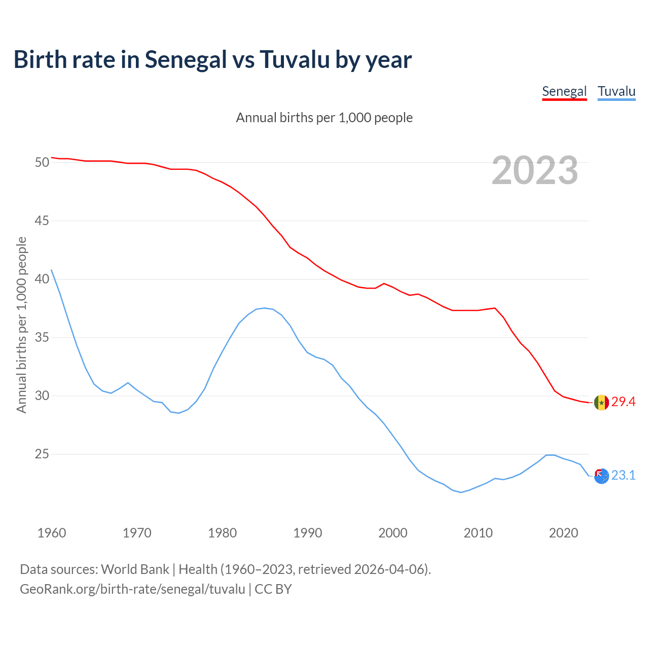 Senegal has an annual birth rate of 29.4 births per 1,000 people, compared to 23.1 for Tuvalu. The average number of children a woman is expected to have during her lifetime — the fertility rate, is 3.82 in Senegal and 3.21 in Tuvalu — 16% difference.