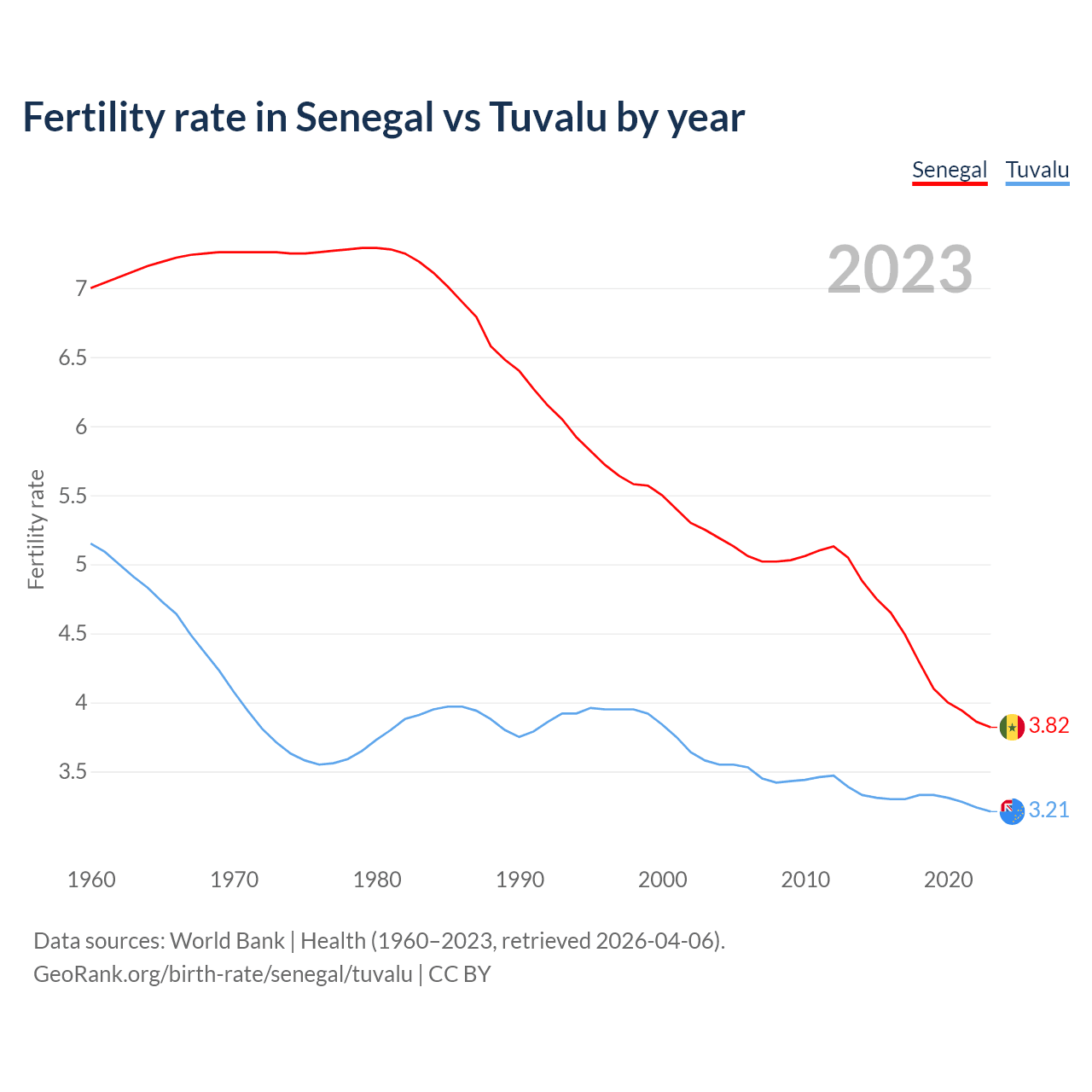 According to the latest available data on birth rates, the fertility rate in Senegal was 3.82 children per woman in 2023, compared to 3.21 in Tuvalu in 2023. The replacement level is considered to be 2.1 children per woman.