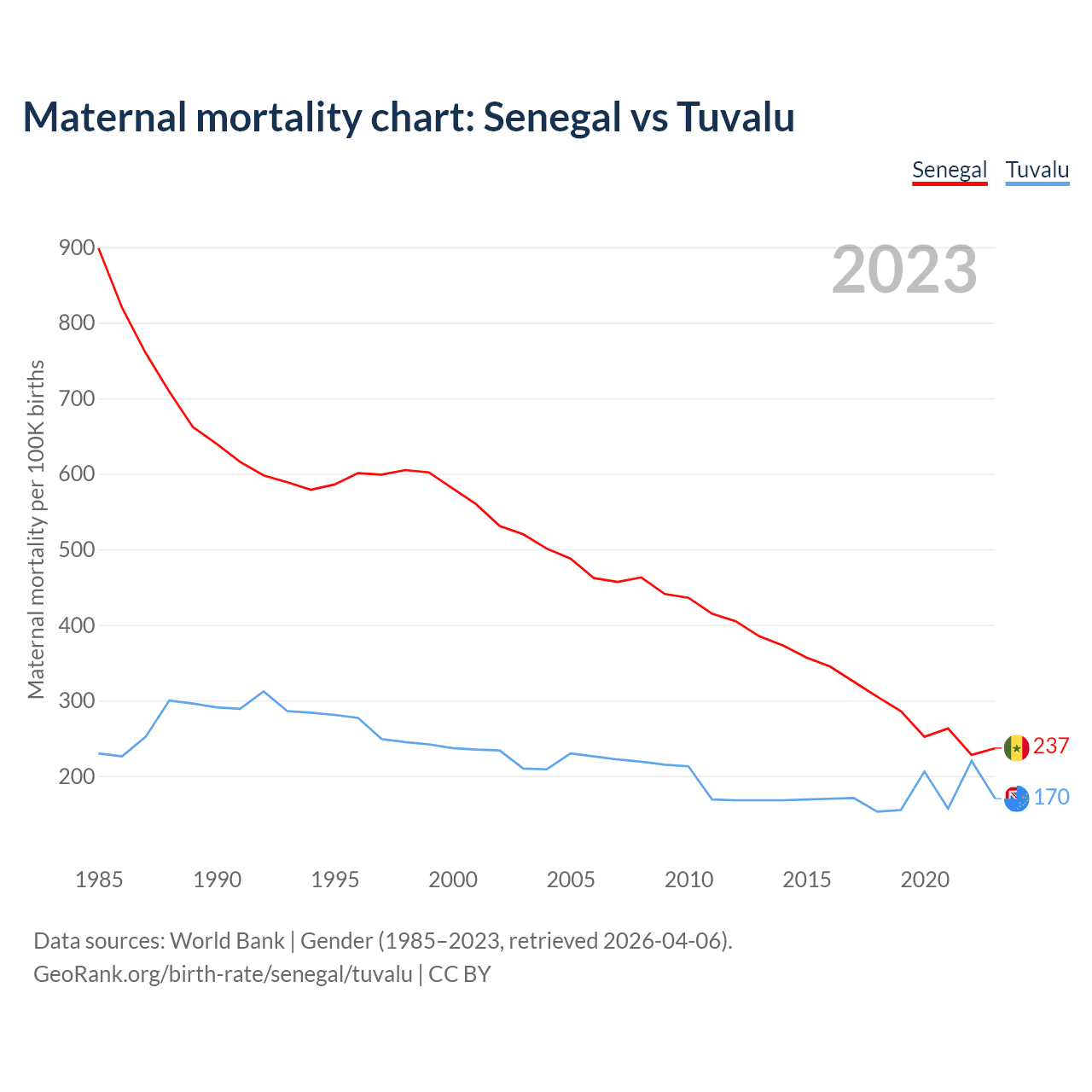 The maternal mortality rate, which is the probability of dying during childbirth or within 42 days of pregnancy termination, is 237 deaths per 100,000 live births in Senegal, compared to 170 deaths in Tuvalu.