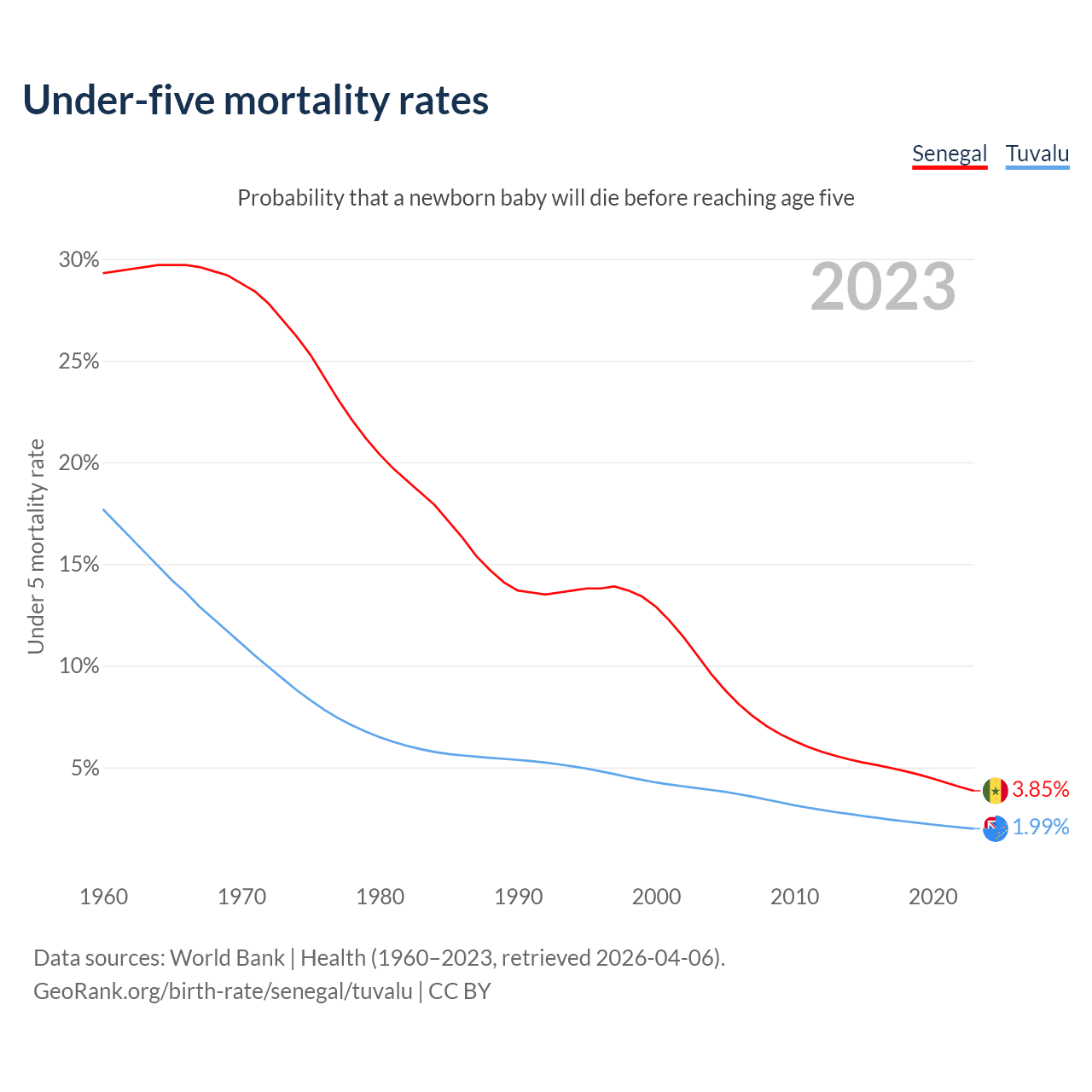 The chance that a newborn baby will die before reaching age five is 3.85% in Senegal and 1.99% in Tuvalu. Above is a chart with historical data on under-five mortality rates.